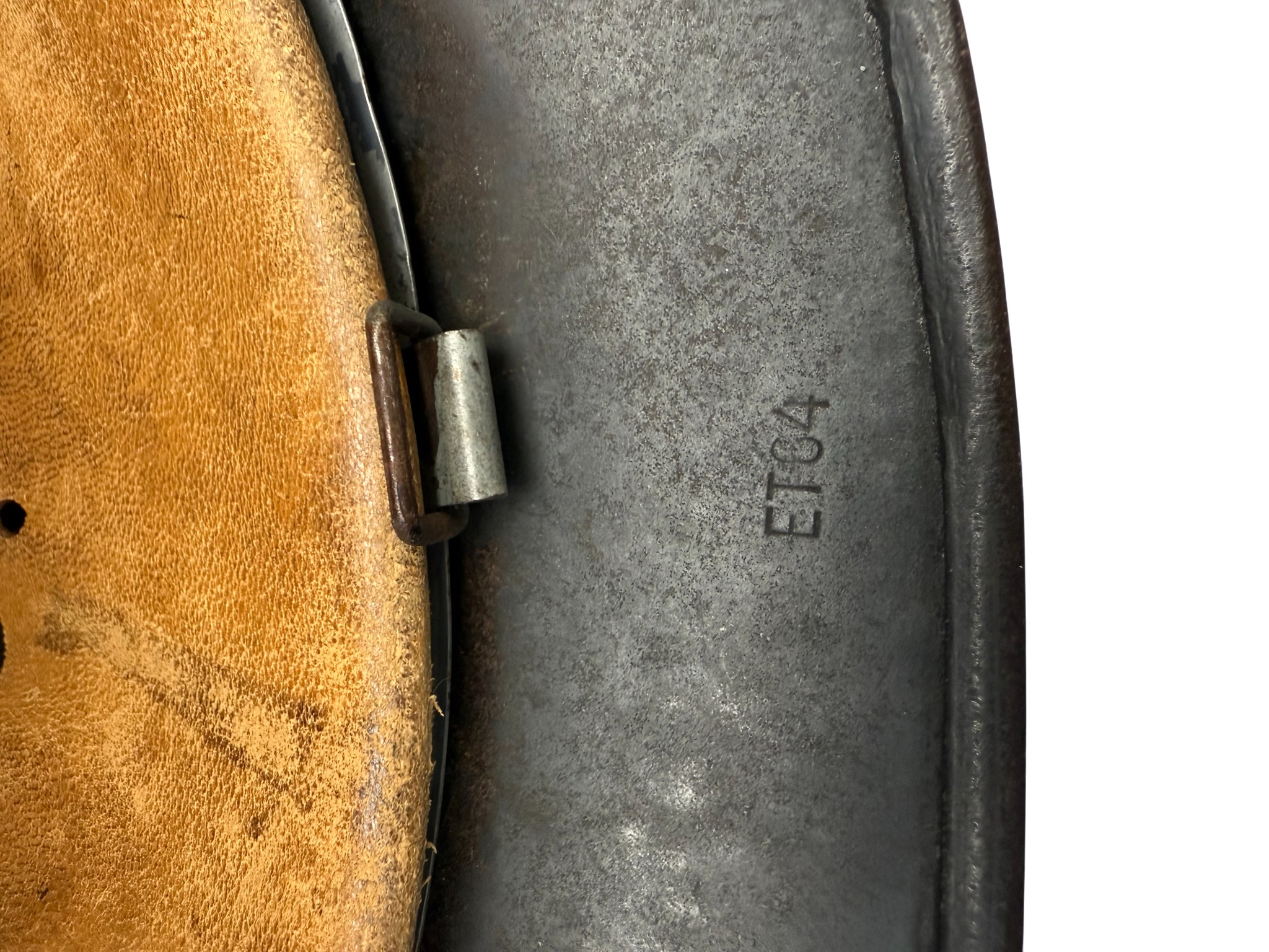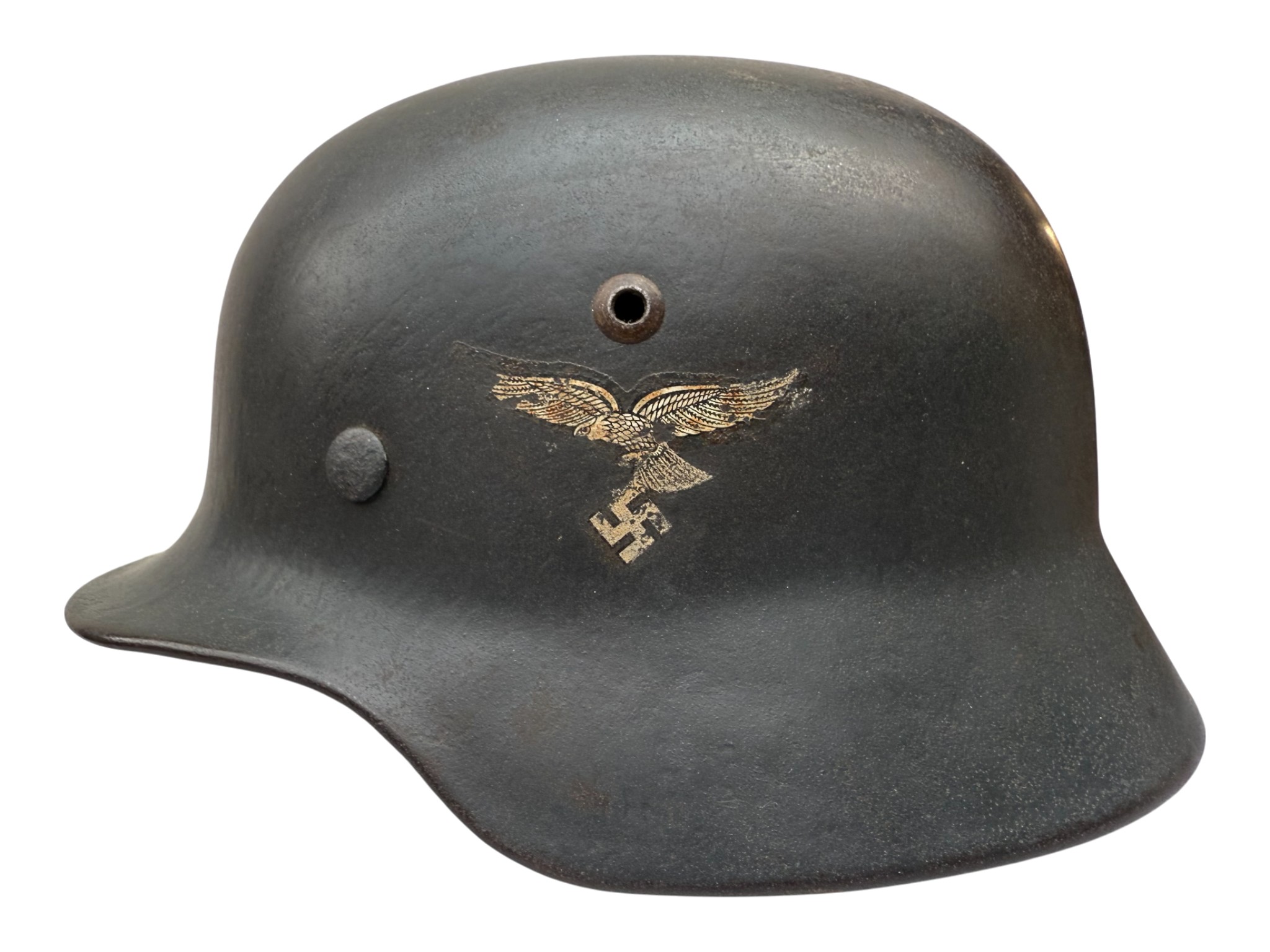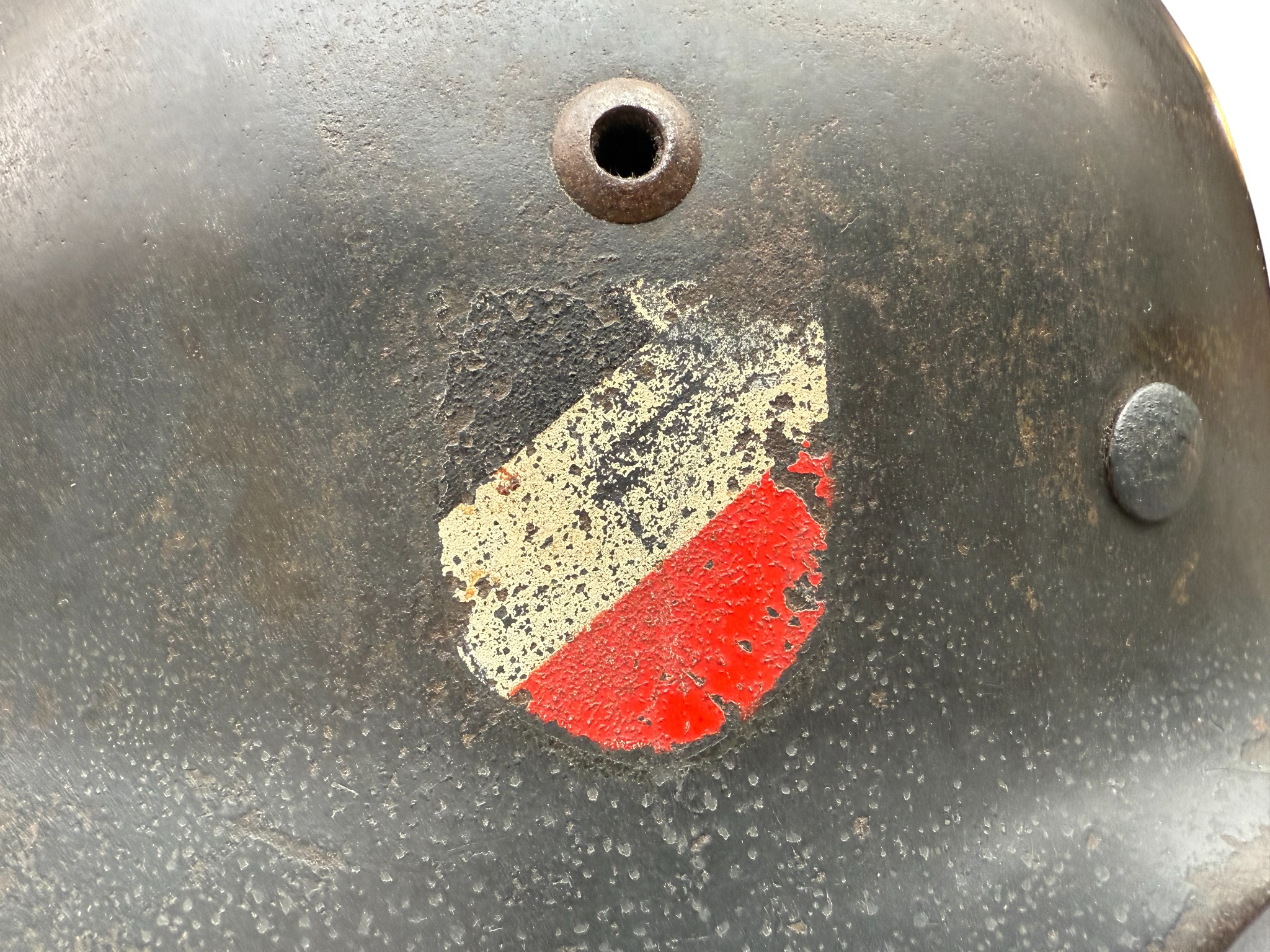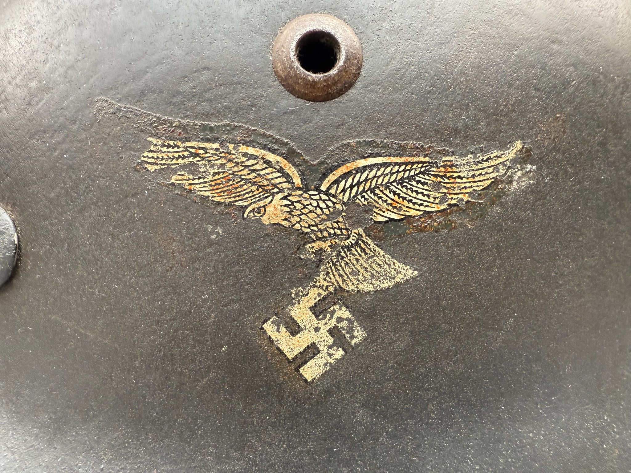Early m35 DD Luftwaffe helmet. Nice visible decals, dark blue paint. Liner in good condition. Just nice worn early luftwaffe helmet.