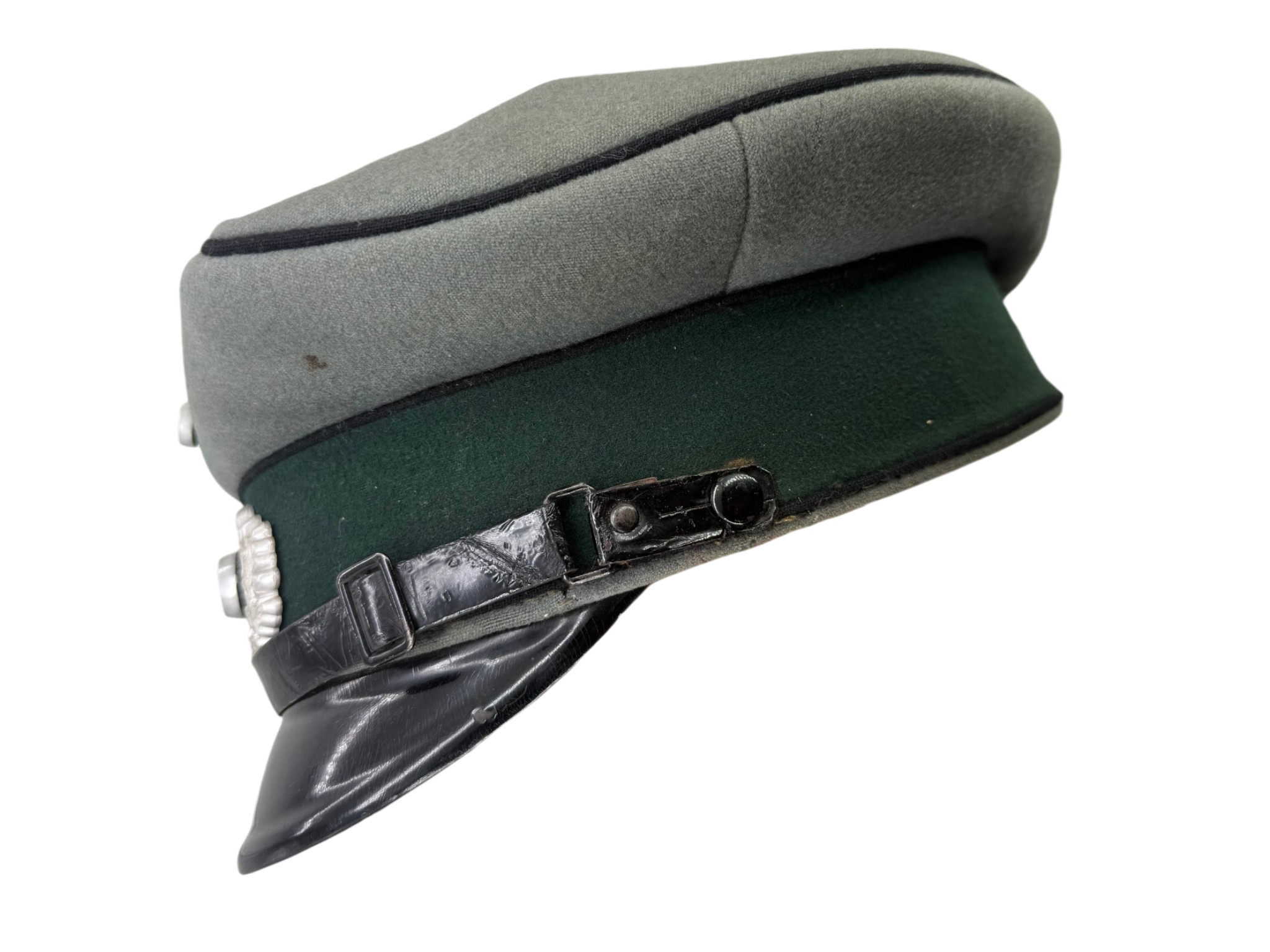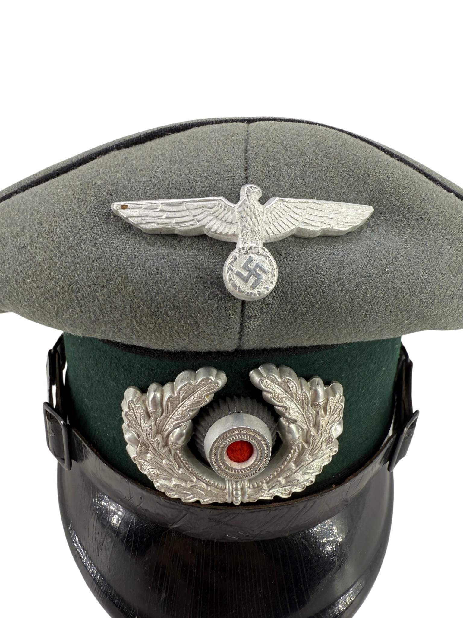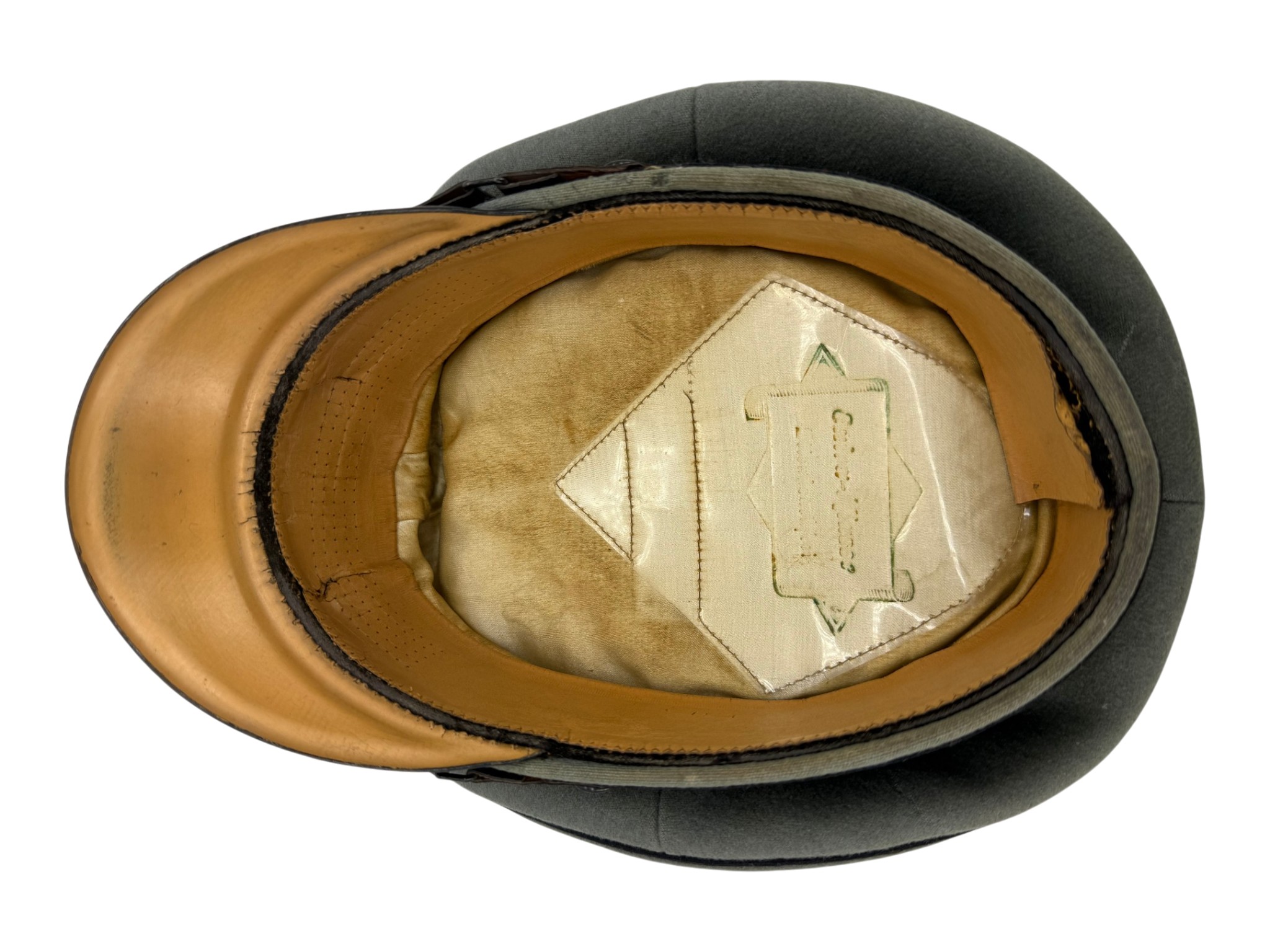 Em/NCO Heer Pionier/combat engineer Visor cap. The cap has traces of use but is in good condition. In some places the seams of the sweatband came loose. The original eagle, however, is possible to have been replaced in this cap or added later. The wreath is intact, original to this hat. To sum up, this is a nice looking original Visor cap of the Heer Pioneer units.