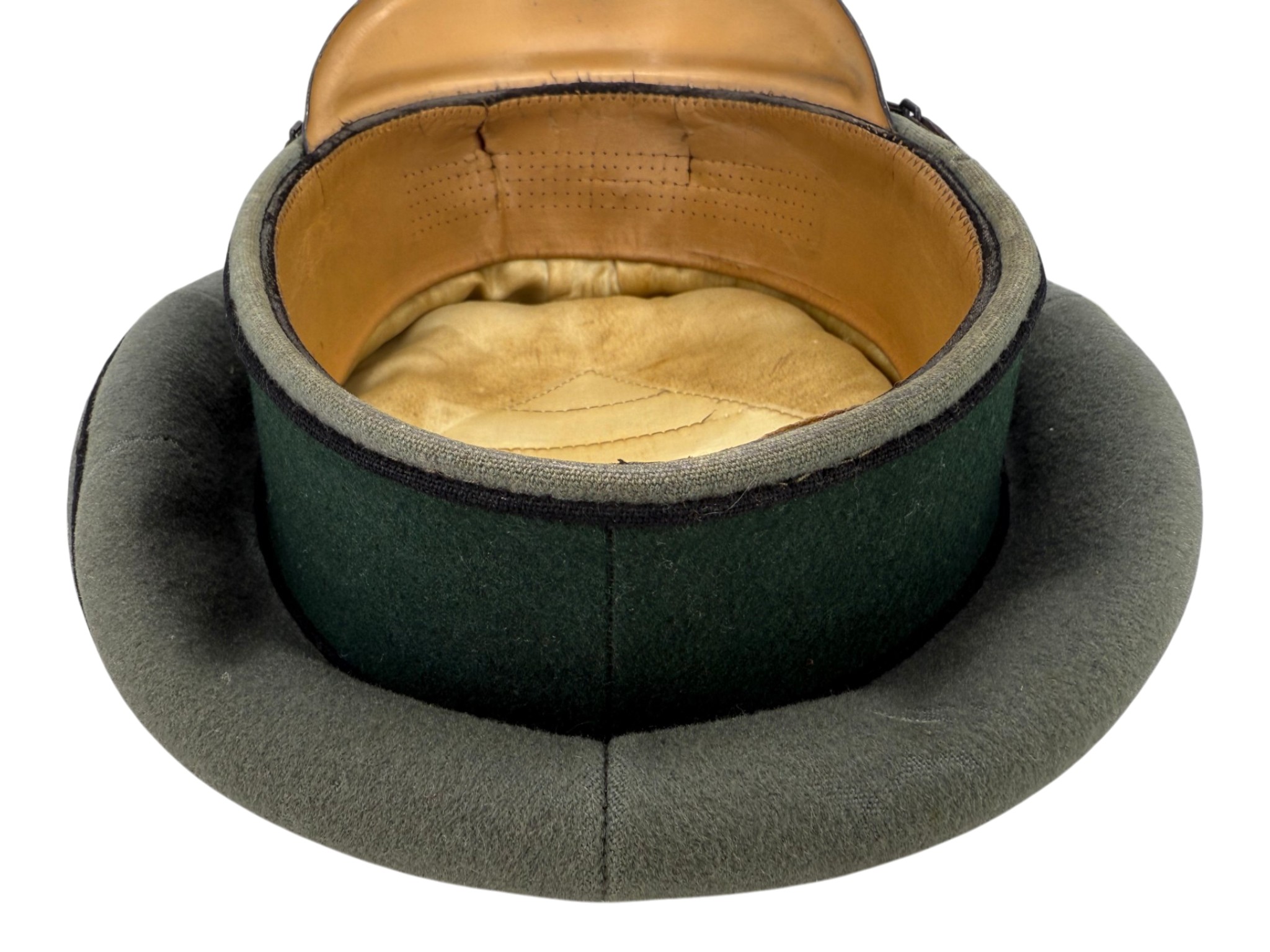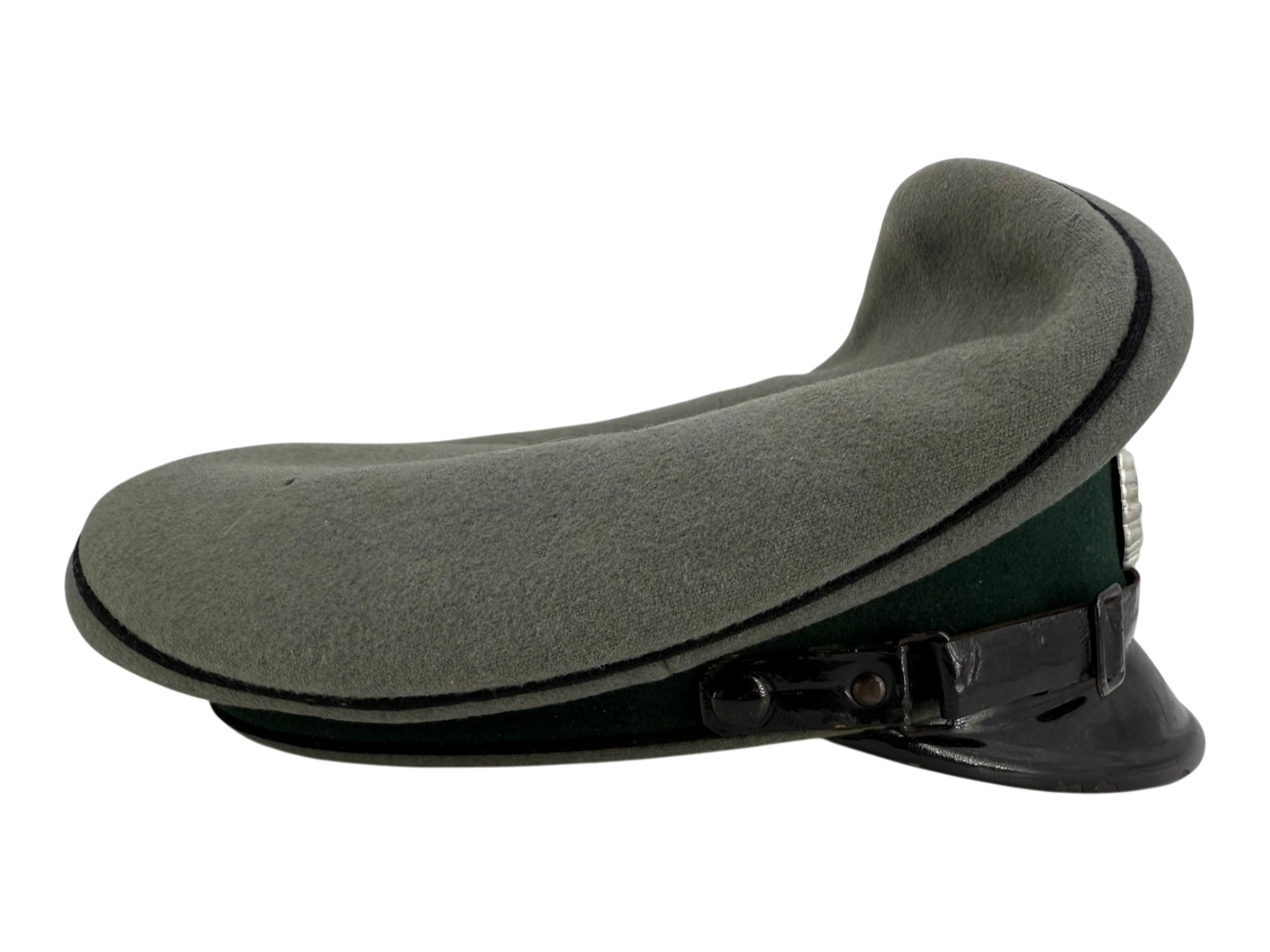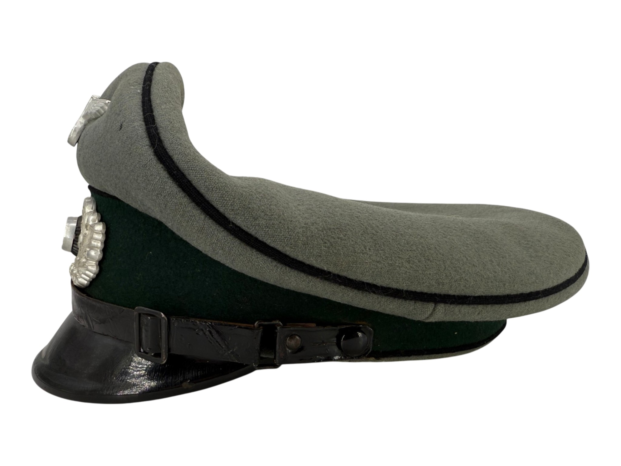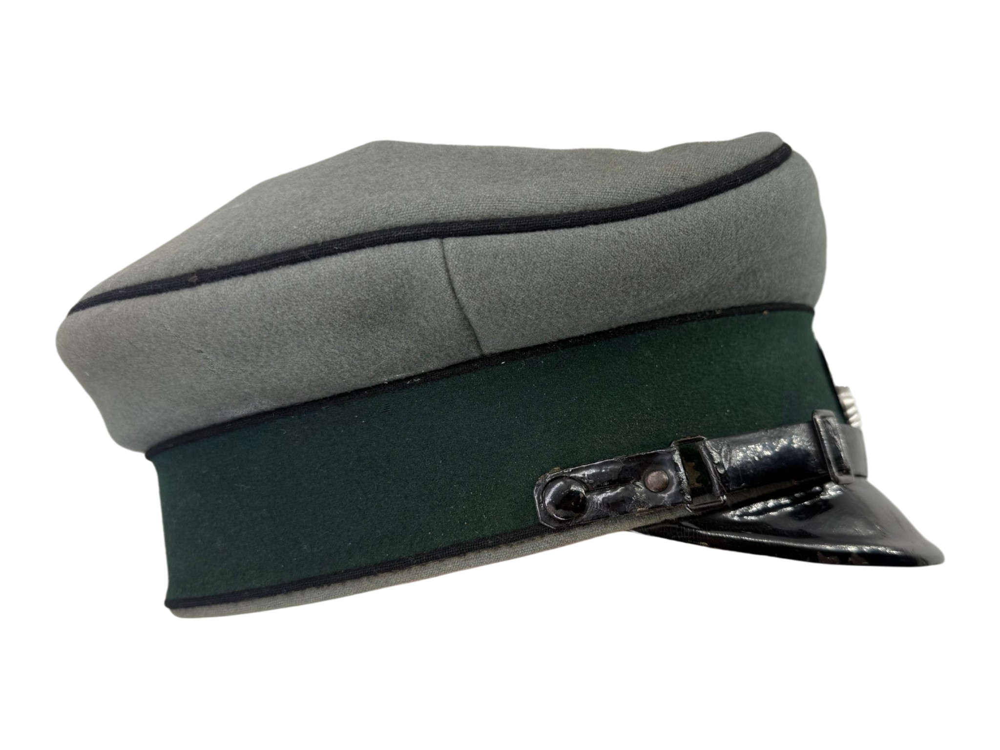 Em/NCO Heer Pionier/combat engineer Visor cap. The cap has traces of use but is in good condition. In some places the seams of the sweatband came loose. The original eagle, however, is possible to have been replaced in this cap or added later. The wreath is intact, original to this hat. To sum up, this is a nice looking original Visor cap of the Heer Pioneer units.