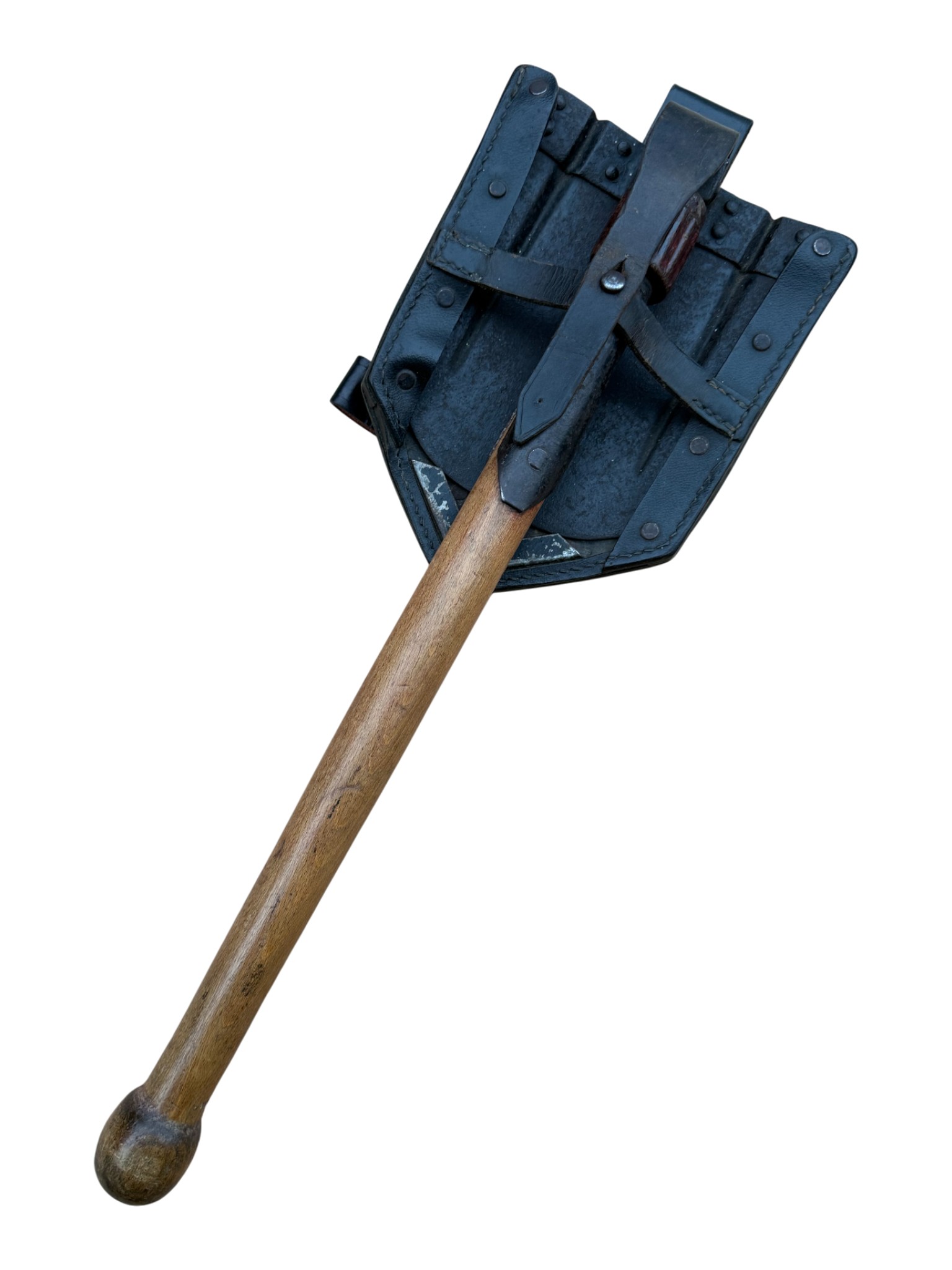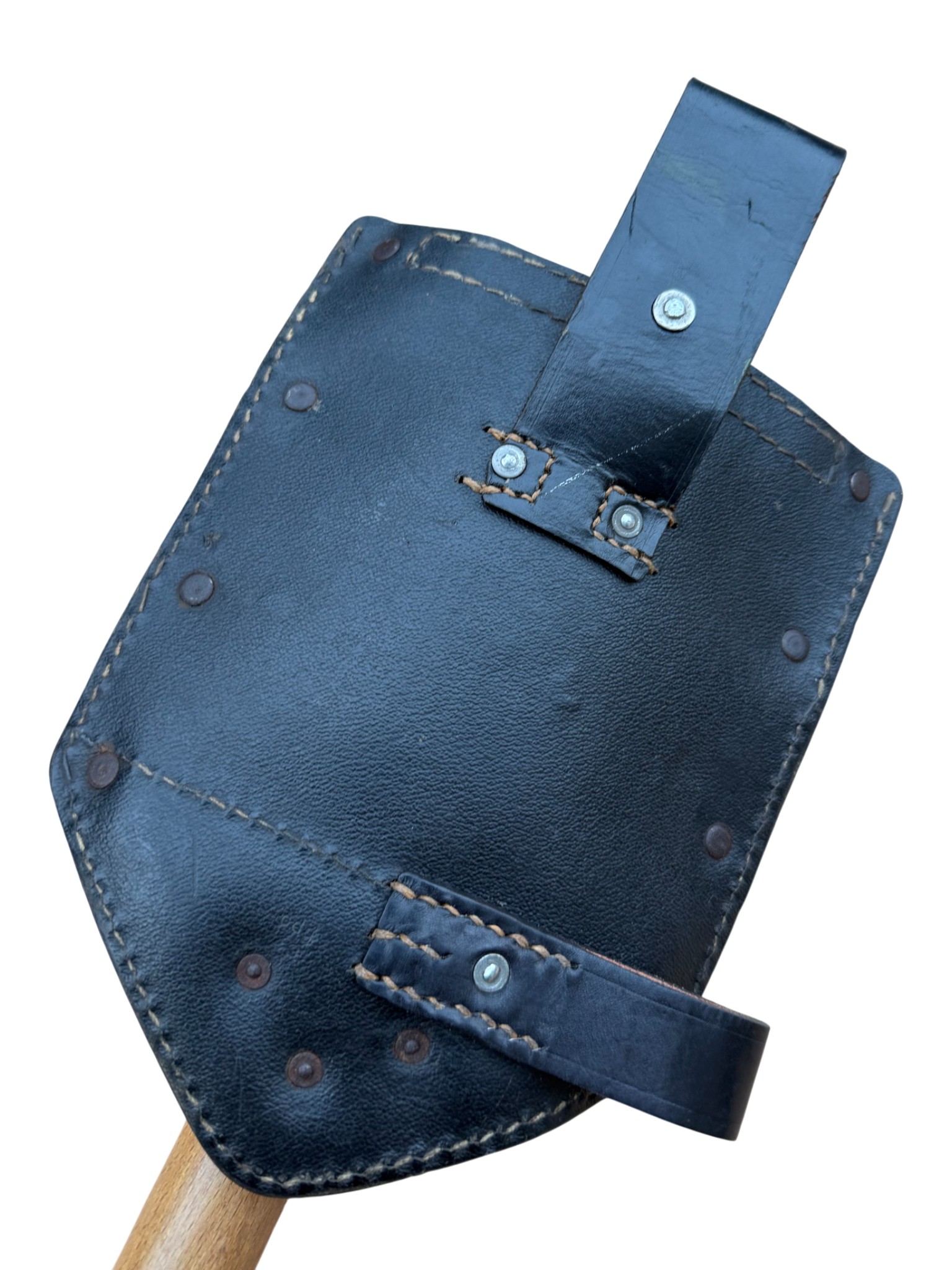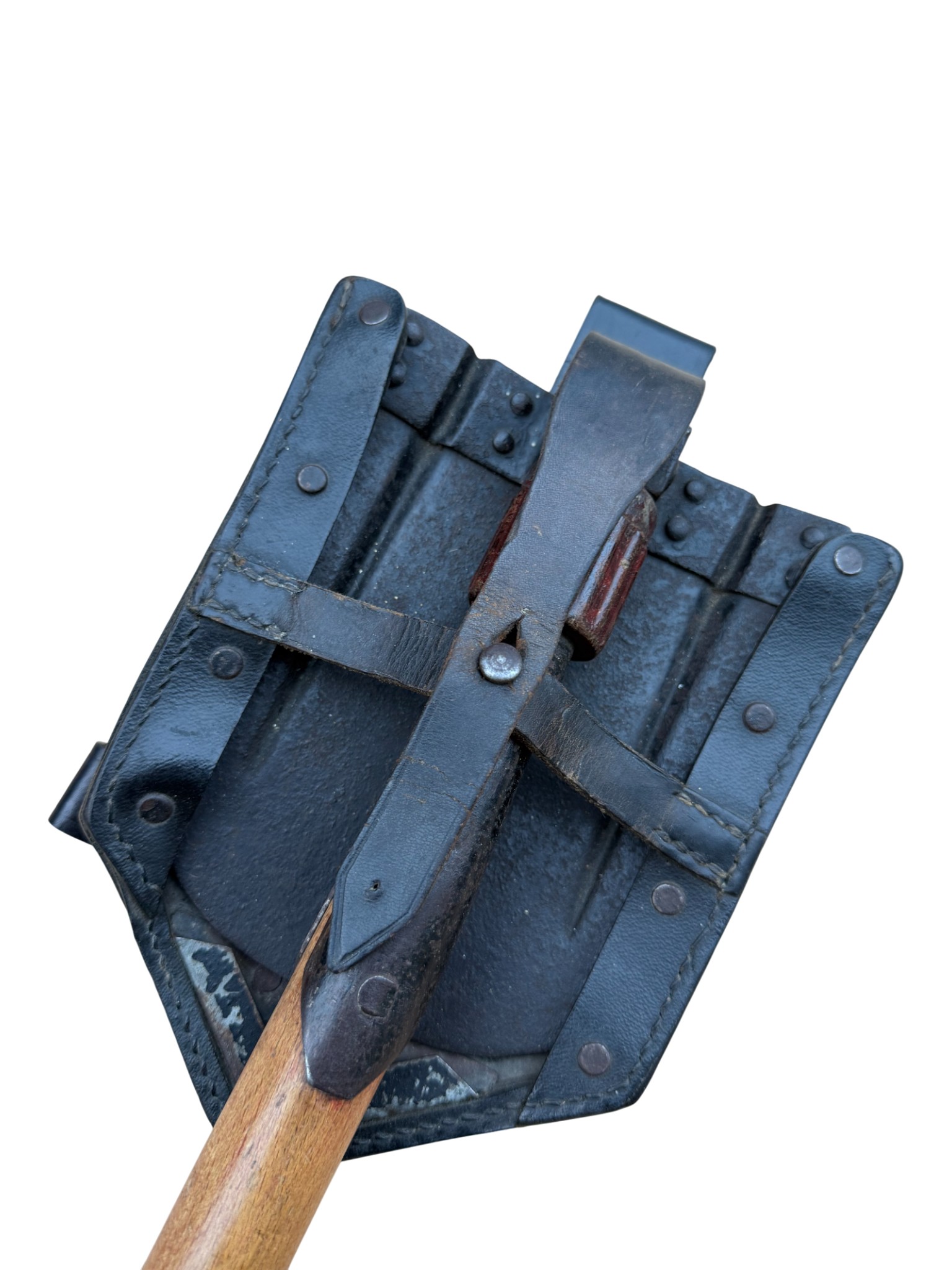 German WH/SS Folding Shovel, cover has a belt strap and bayonet mount added to the back (repair) . It’s nicely signed. The shovel is in heavy used condition.