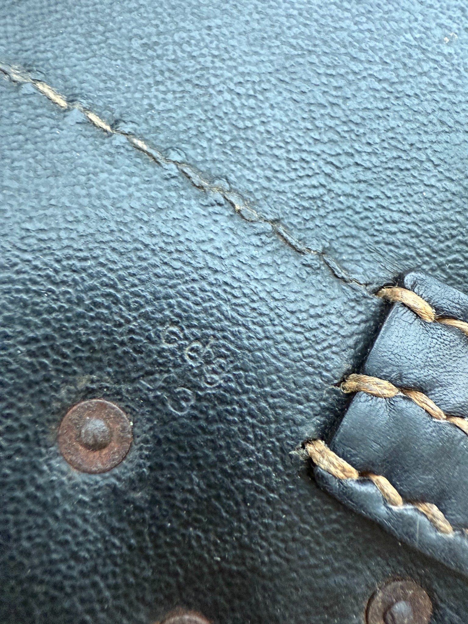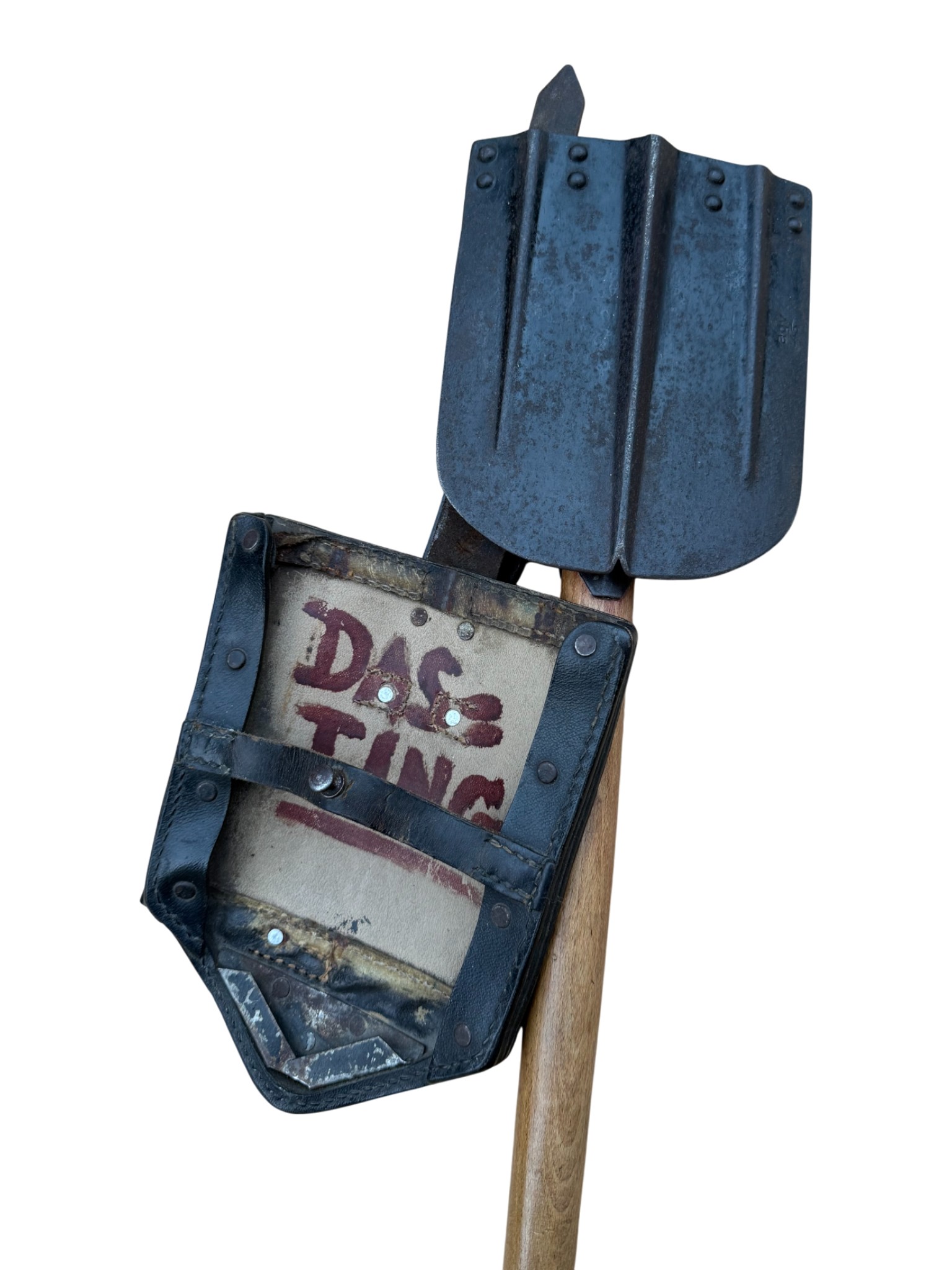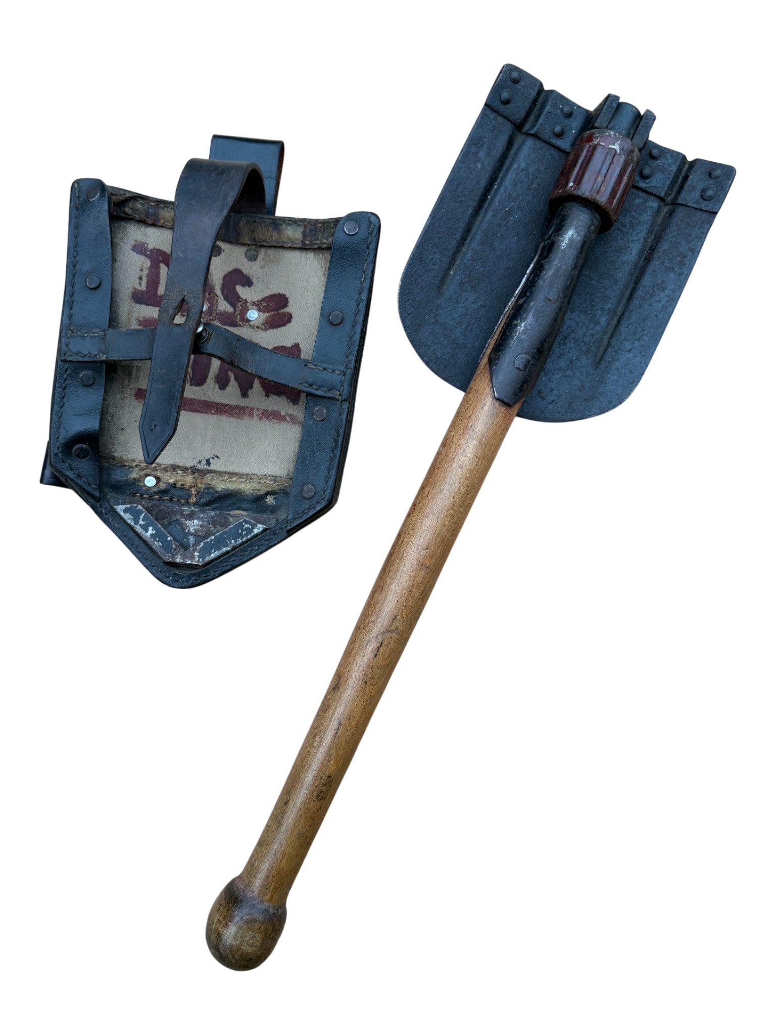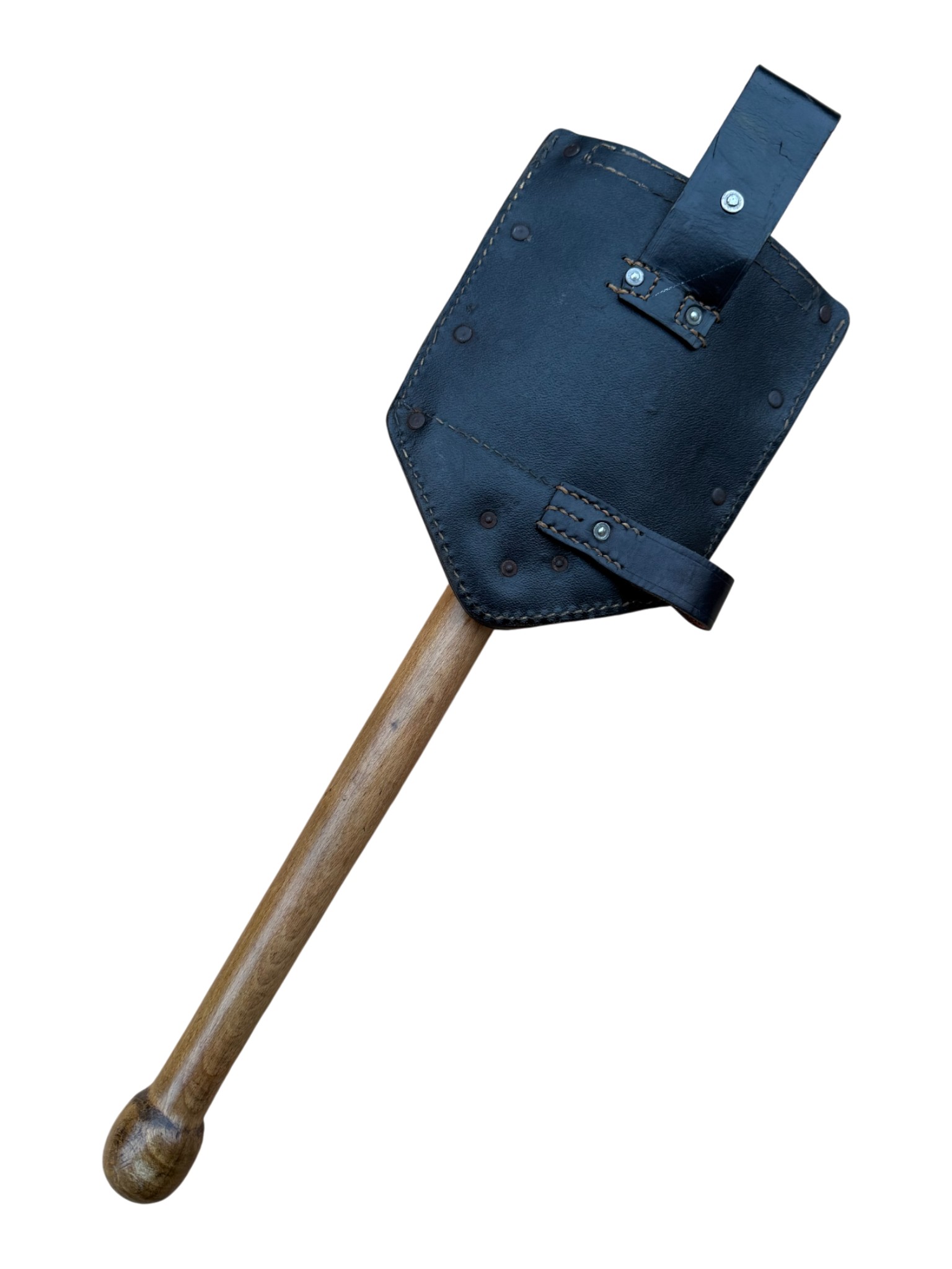 German WH/SS Folding Shovel, cover has a belt strap and bayonet mount added to the back (repair) . It’s nicely signed. The shovel is in heavy used condition.