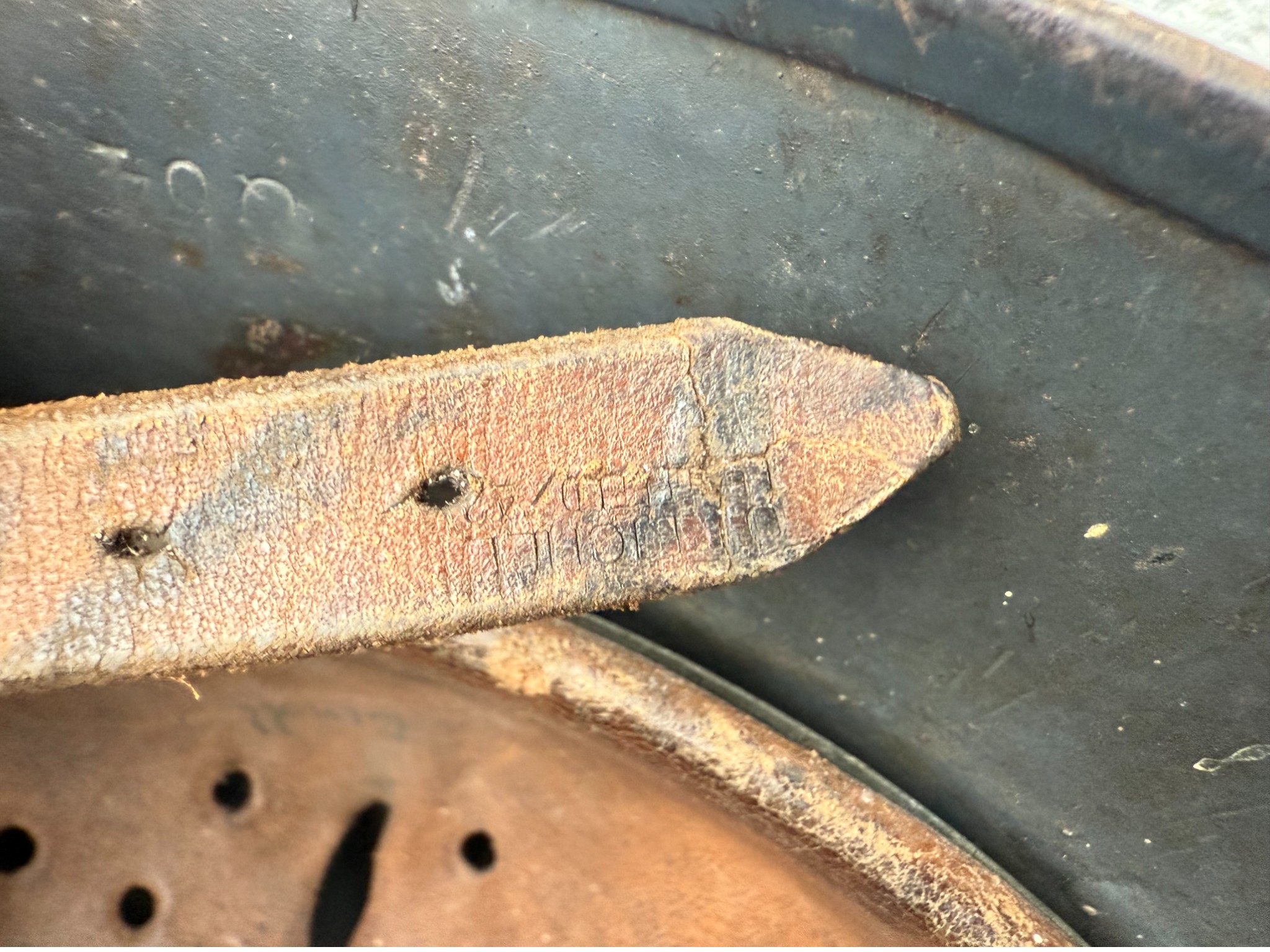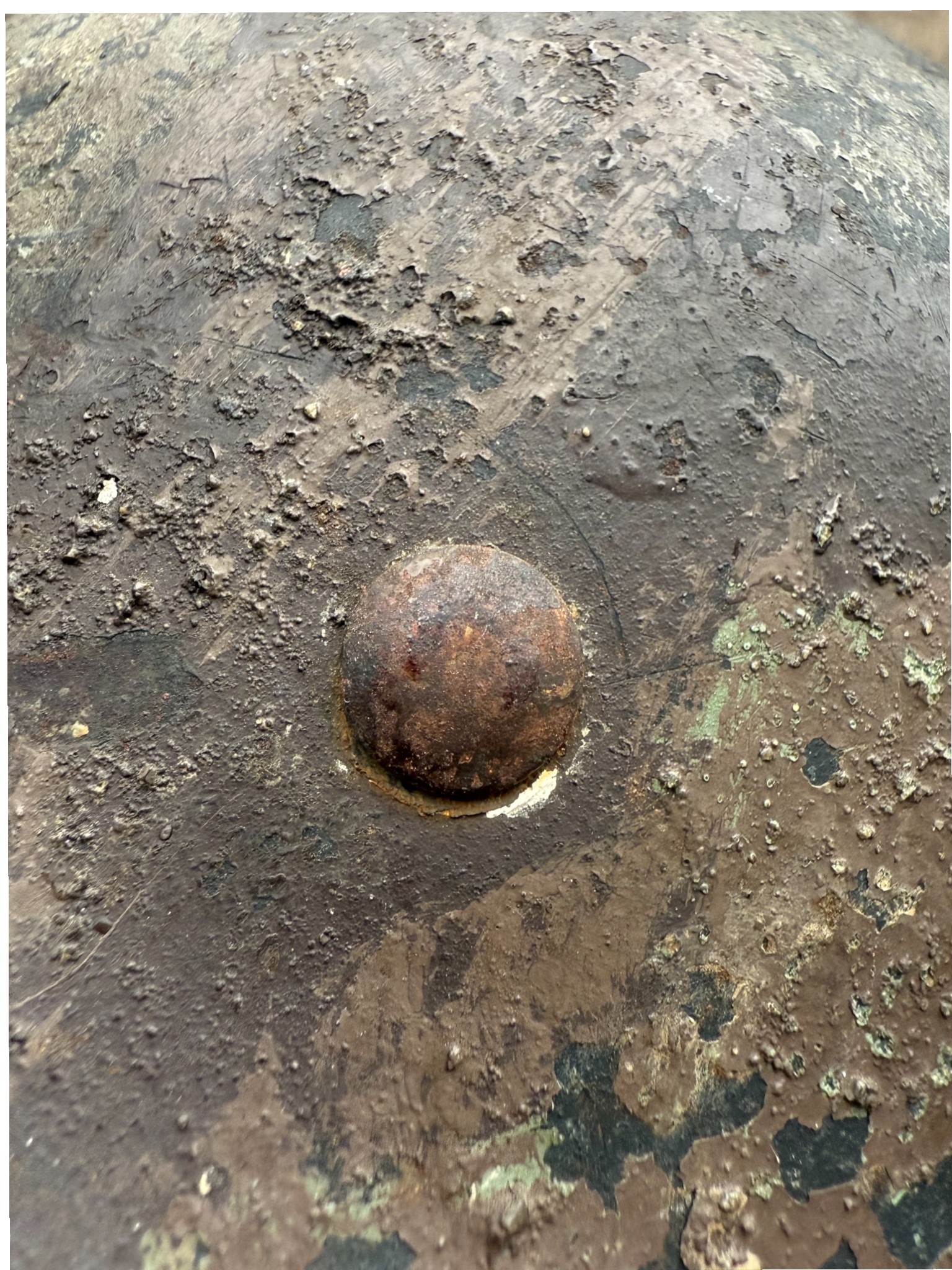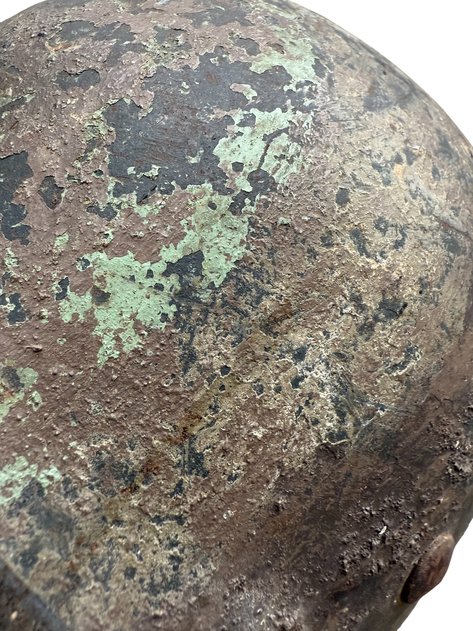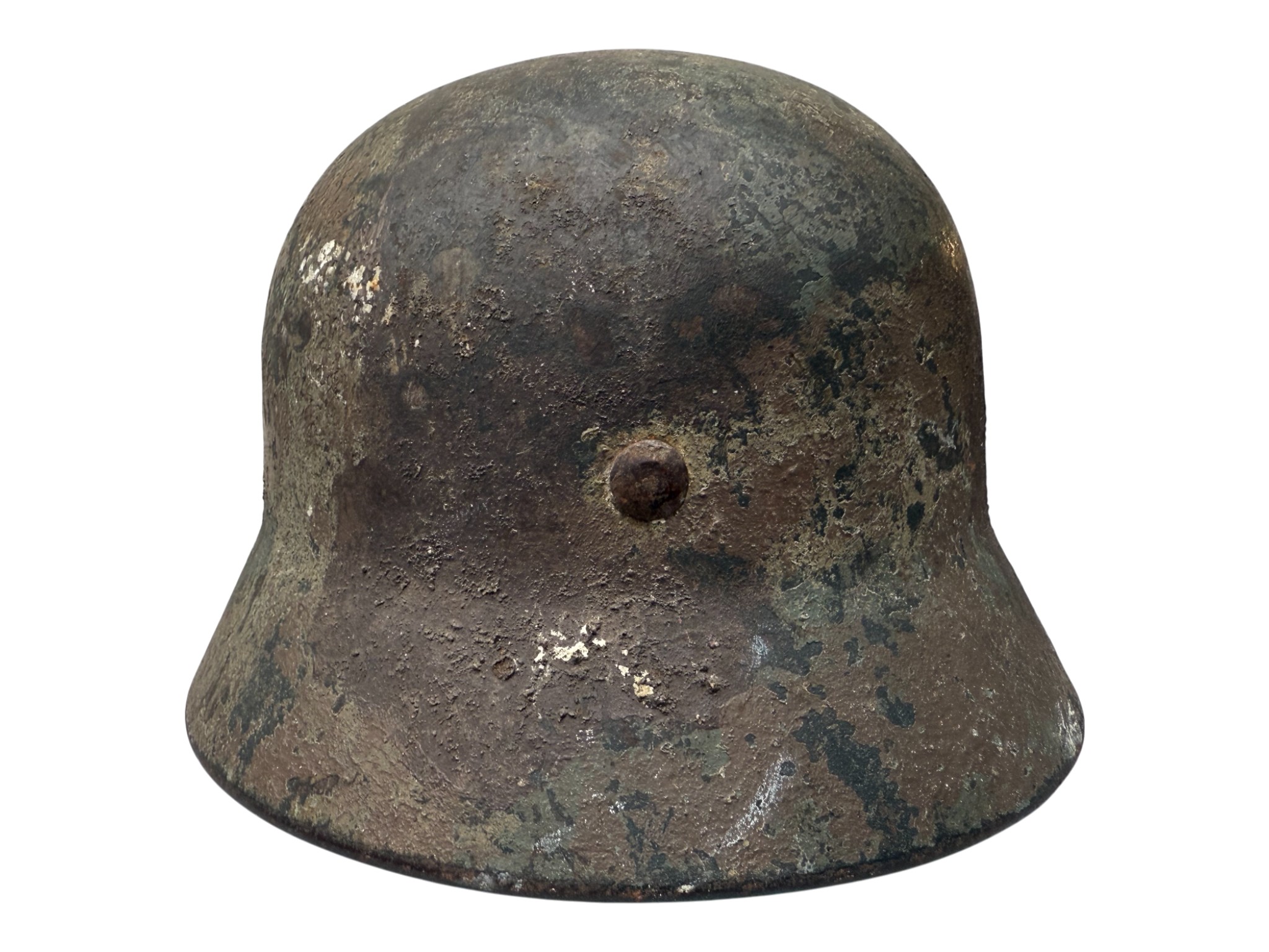 Heer m40 camuflage helmet. Untatched, beautiful camouflage helmet, patina and paint speak for themselves. Camouflage applied with a brush. Named fev times on liner.