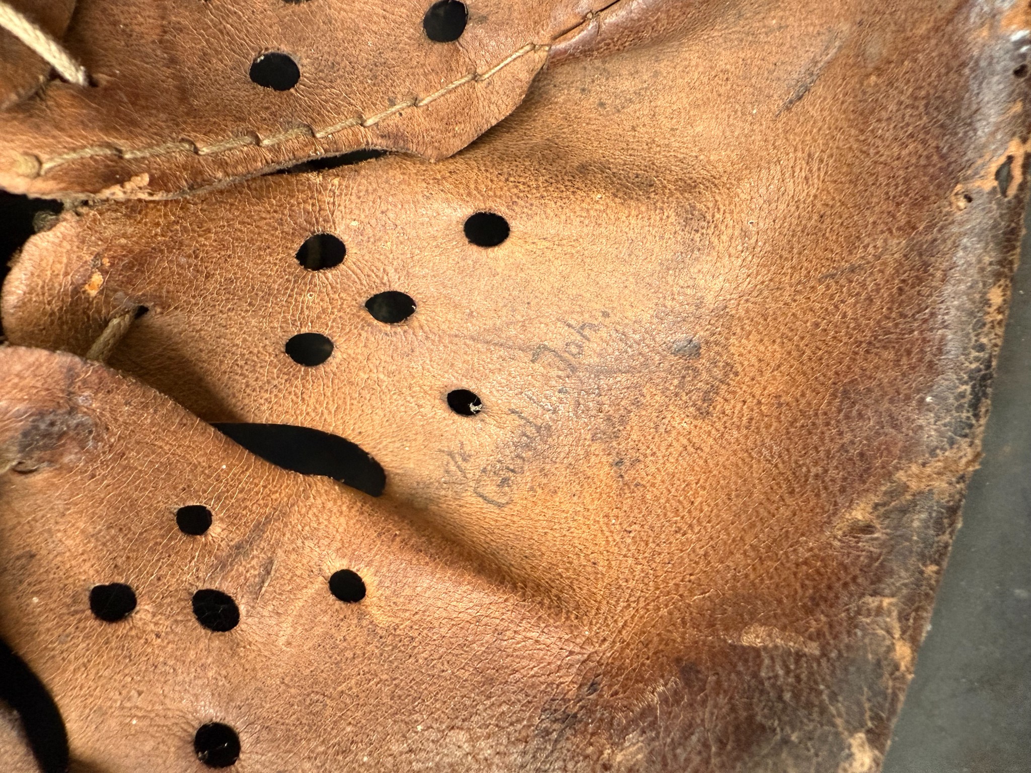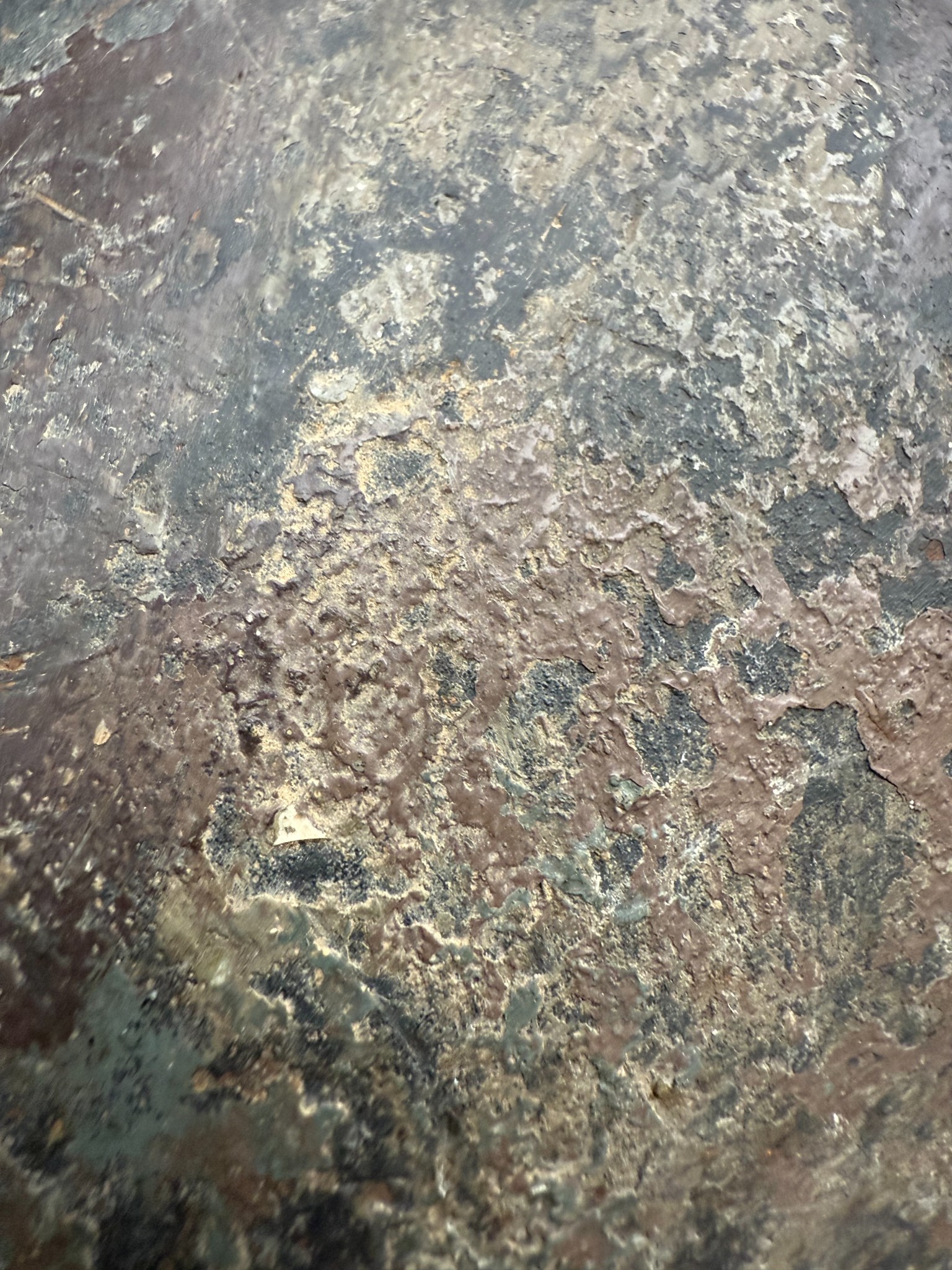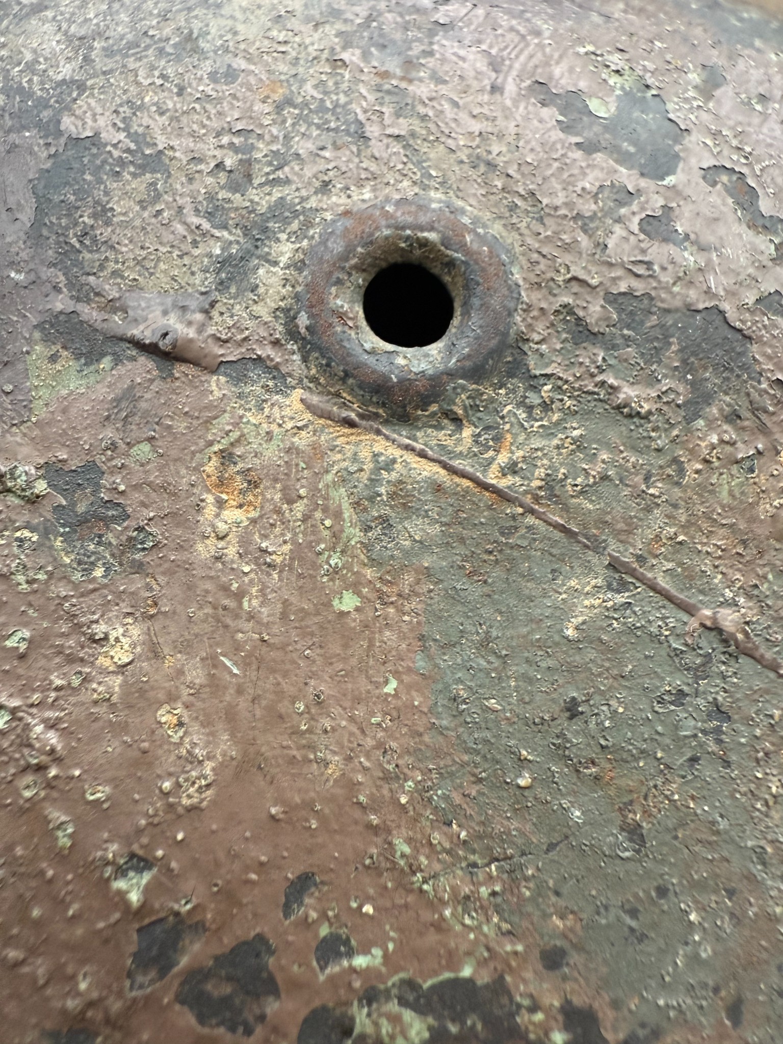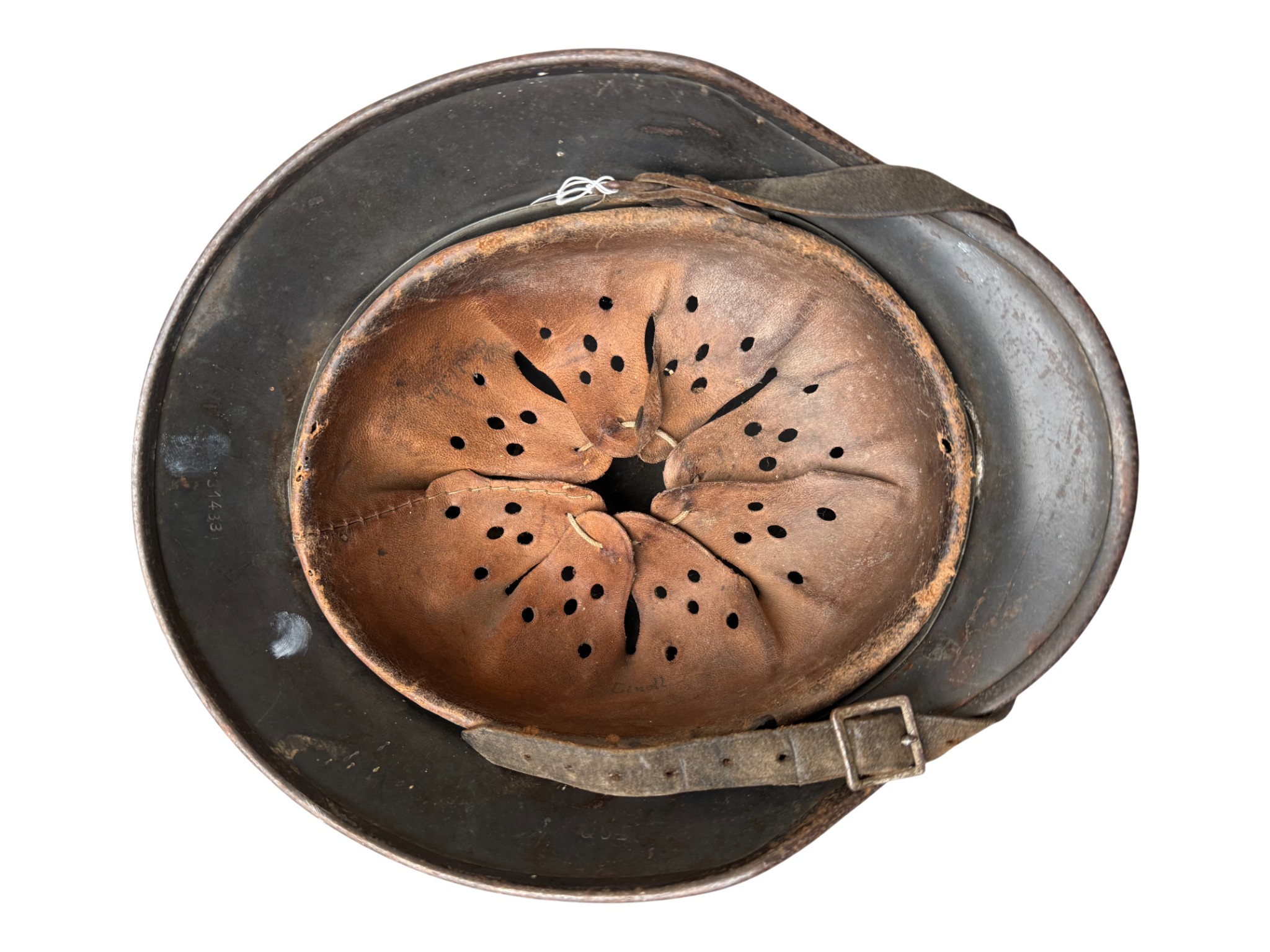 Heer m40 camuflage helmet. Untatched, beautiful camouflage helmet, patina and paint speak for themselves. Camouflage applied with a brush. Named fev times on liner.