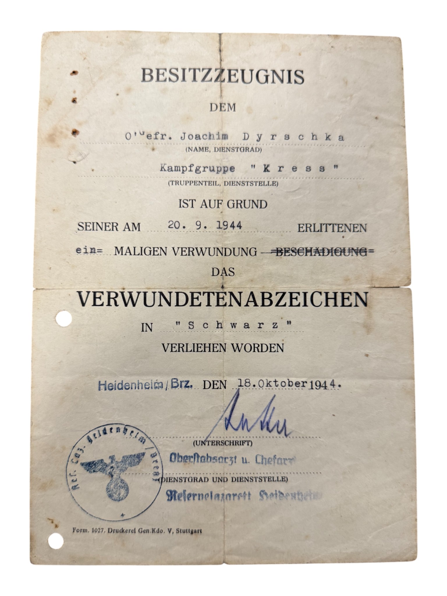 Kampfgruppe Kress 1944 – Wound badge doc. good condition