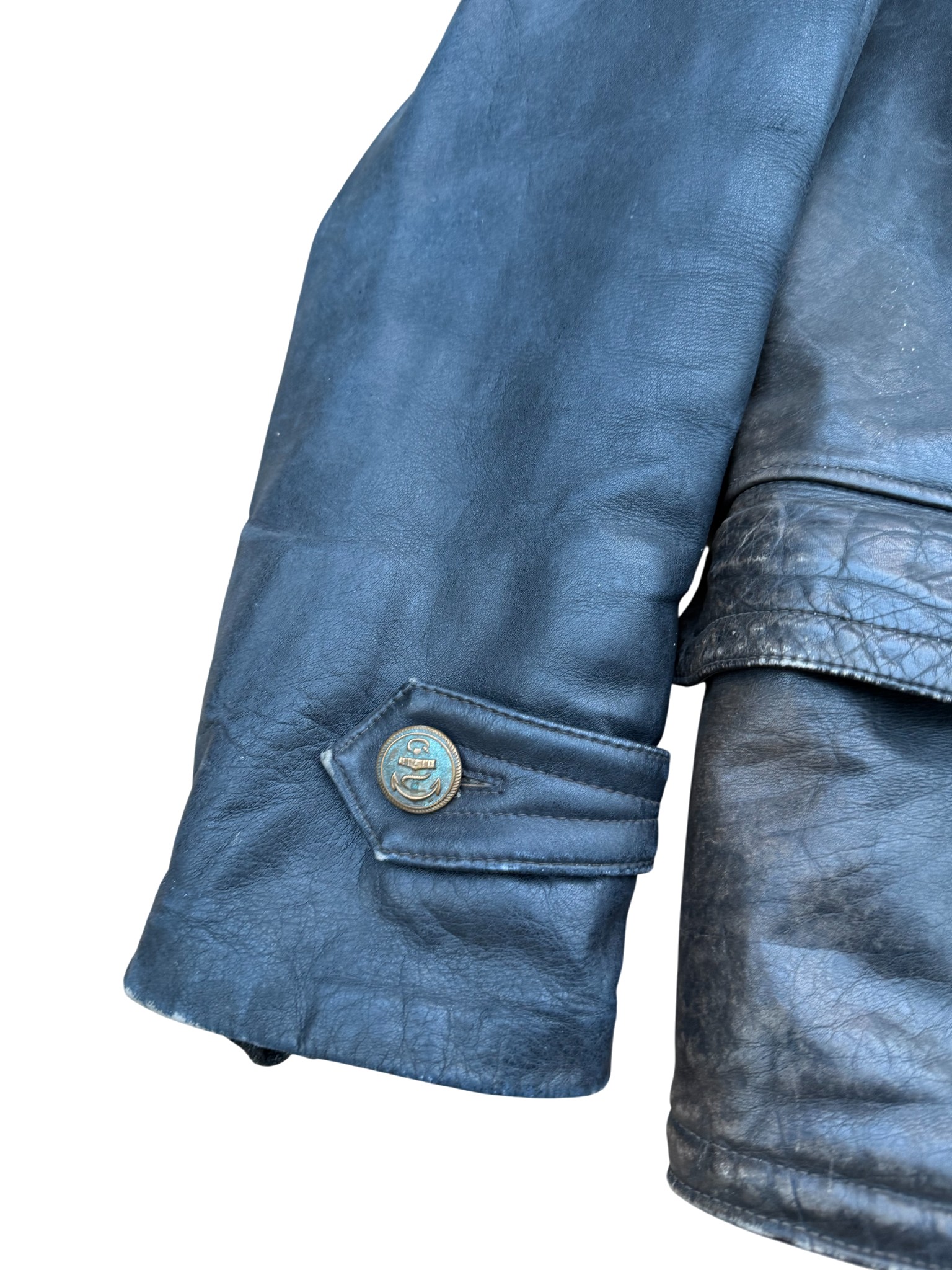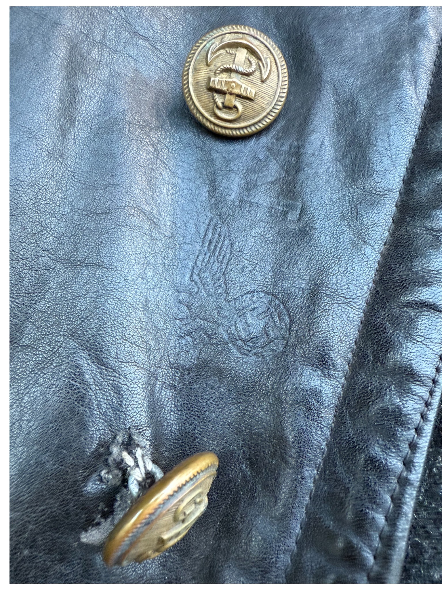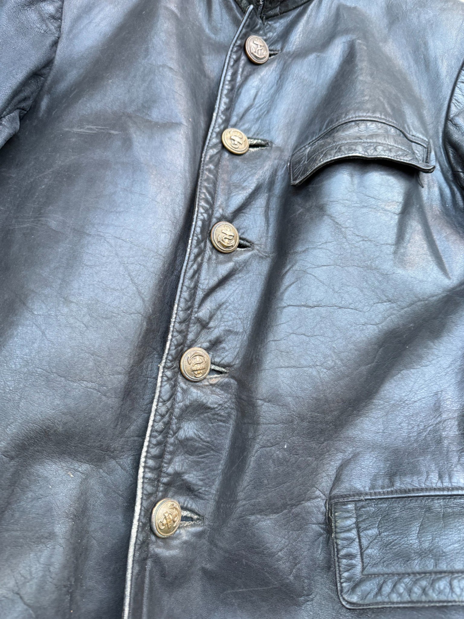 Kriegsmarine Black protective leather jacket “uboot”, good usued condition with original buttons and nice Stamp Eagle and M on leather.