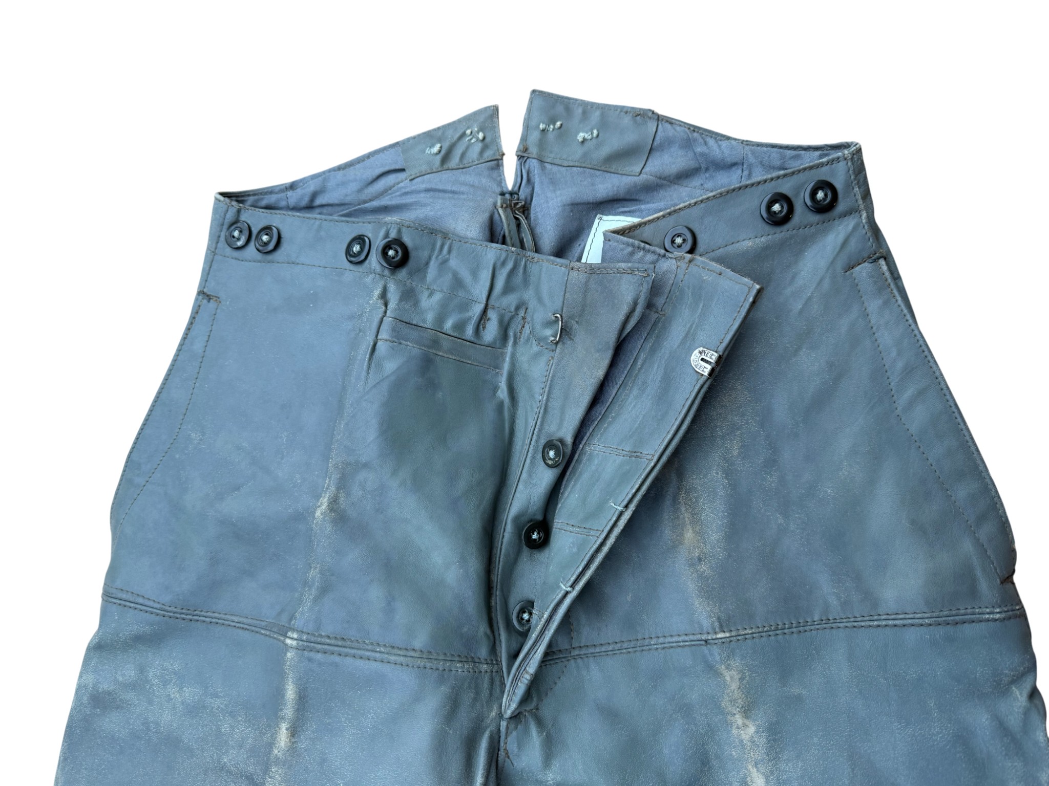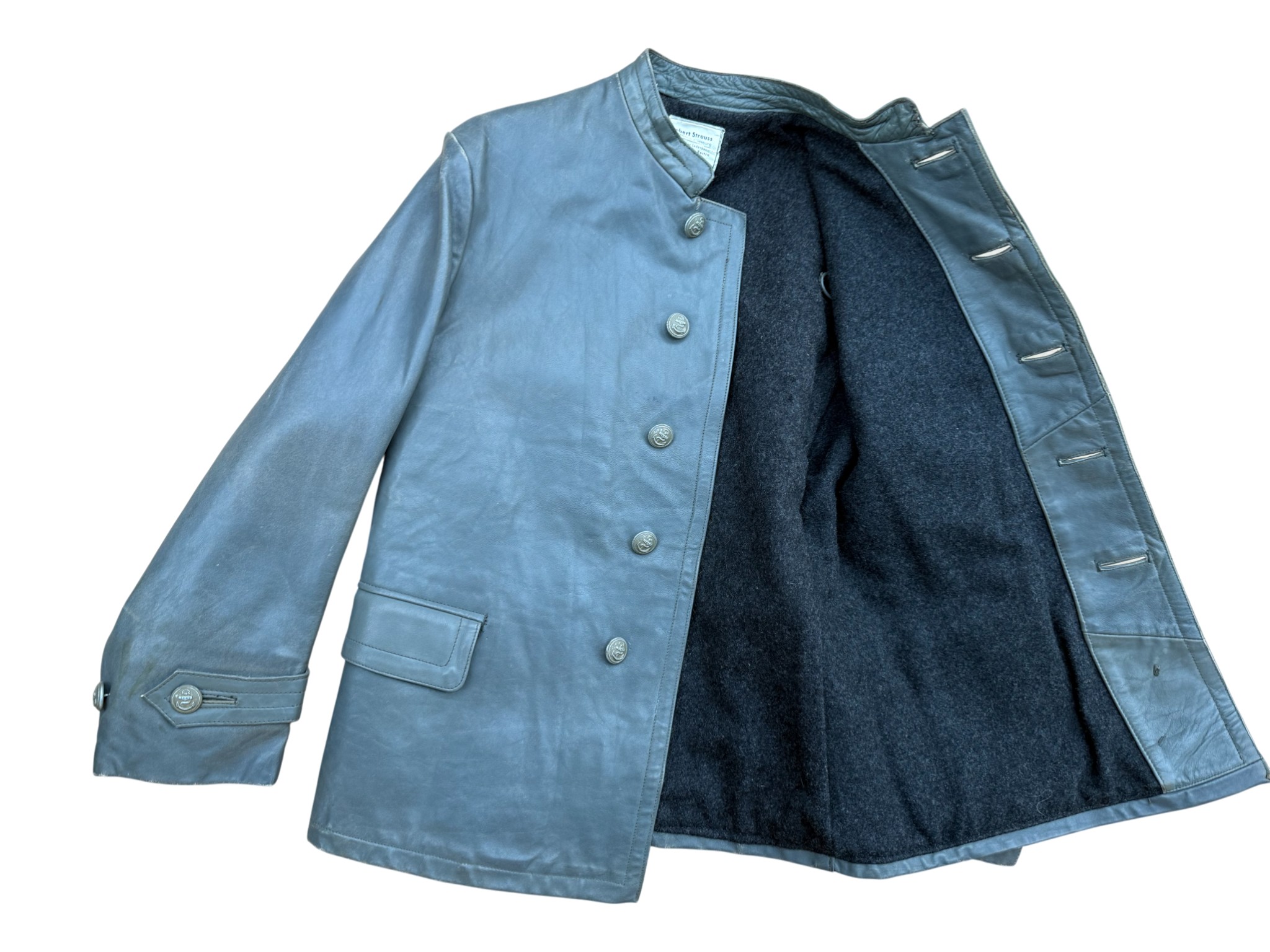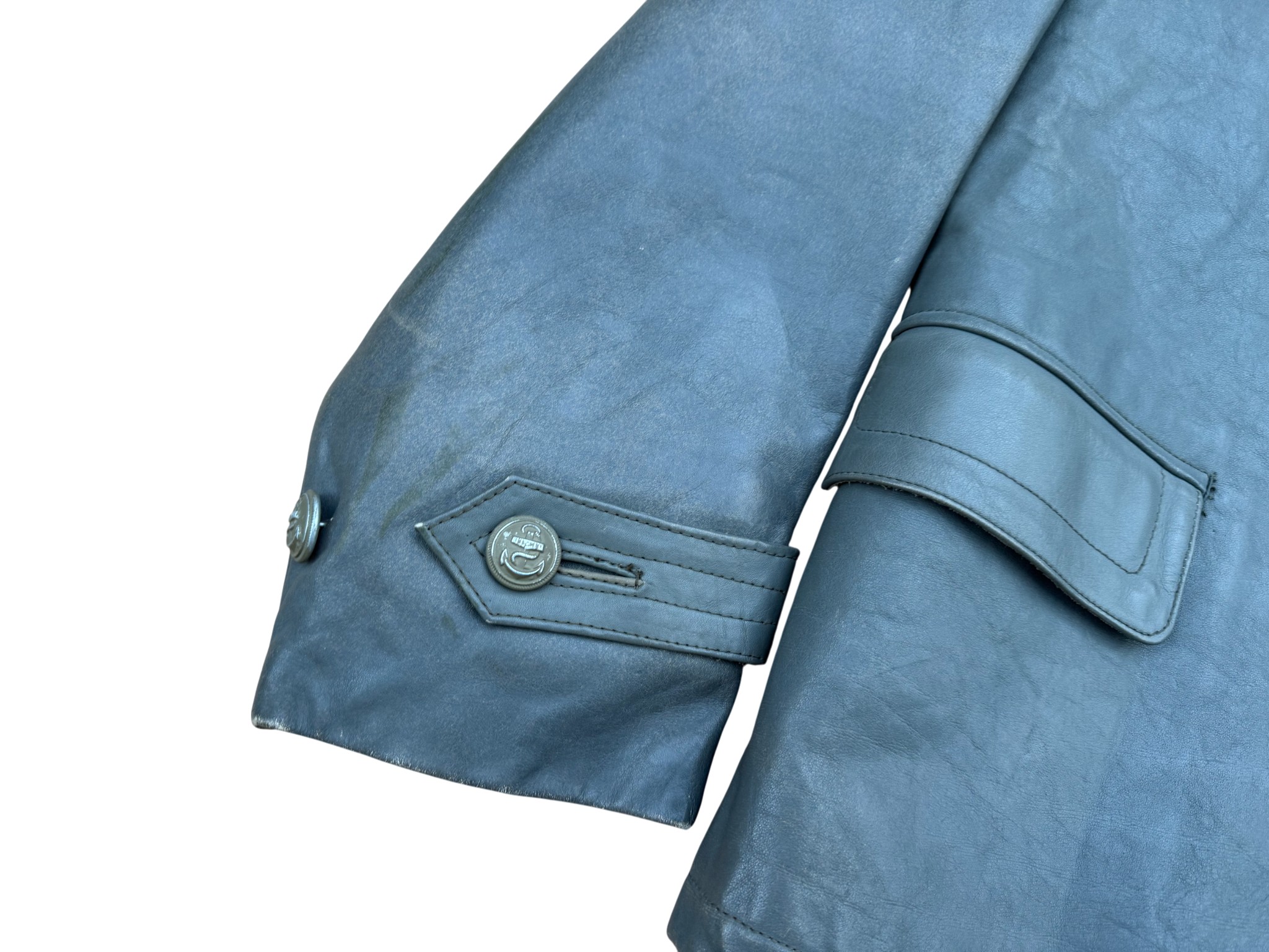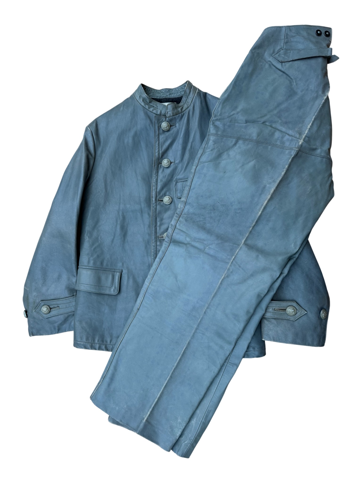 Kriegsmarine gray protective leather jacket and trousers “uboot” set in perfect condition, all orginal sevn buttons on jacket – looks like unused. all with same marker label. Hard to upgrade set !