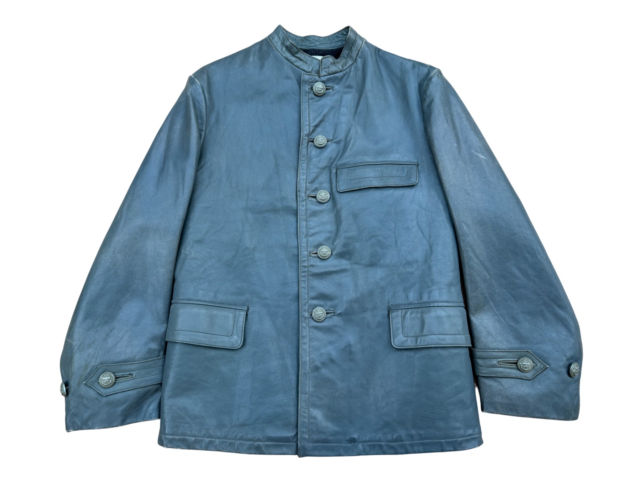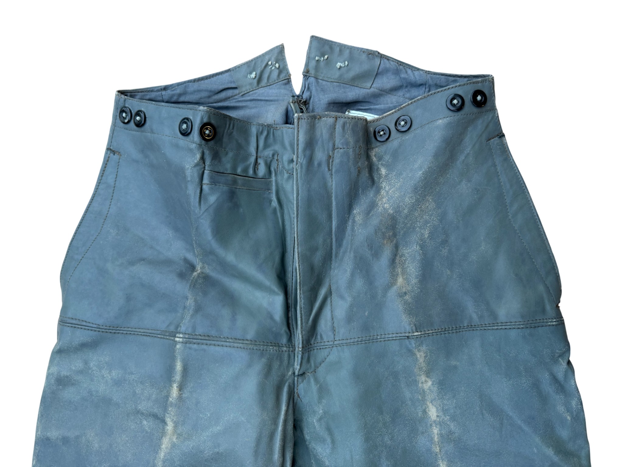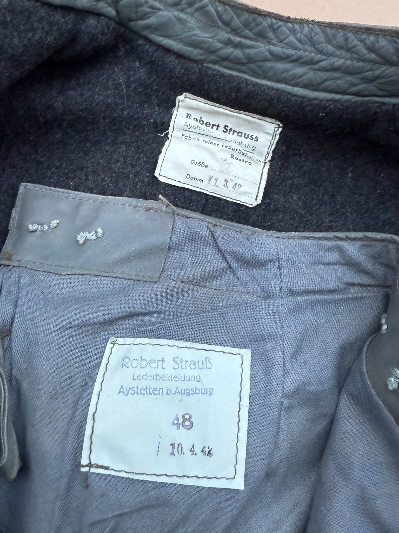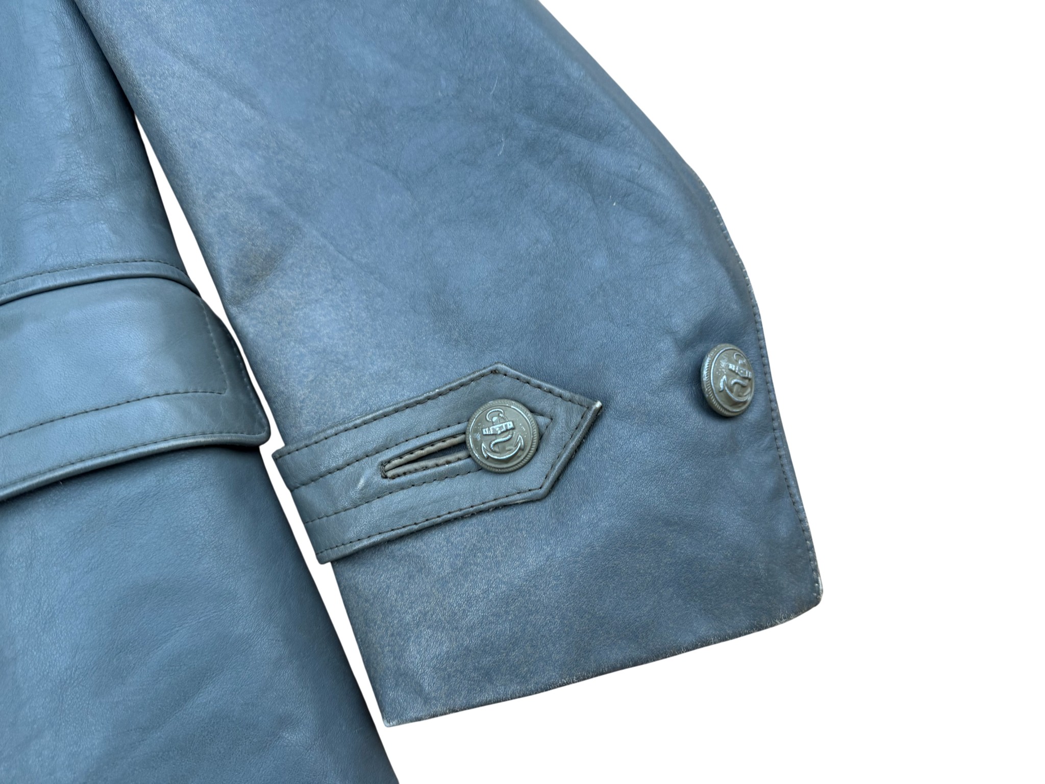 Kriegsmarine gray protective leather jacket and trousers “uboot” set in perfect condition, all orginal sevn buttons on jacket – looks like unused. all with same marker label. Hard to upgrade set !