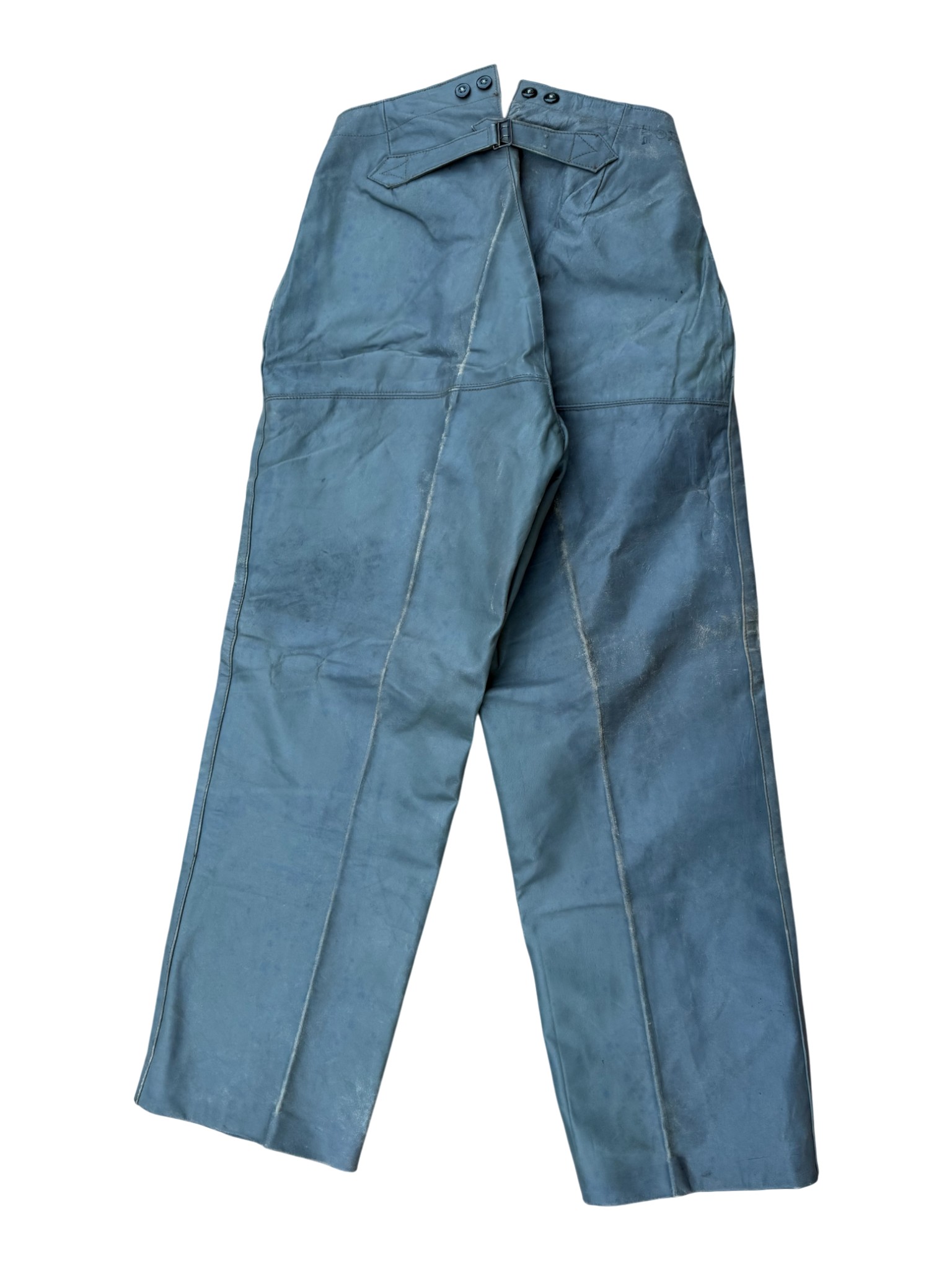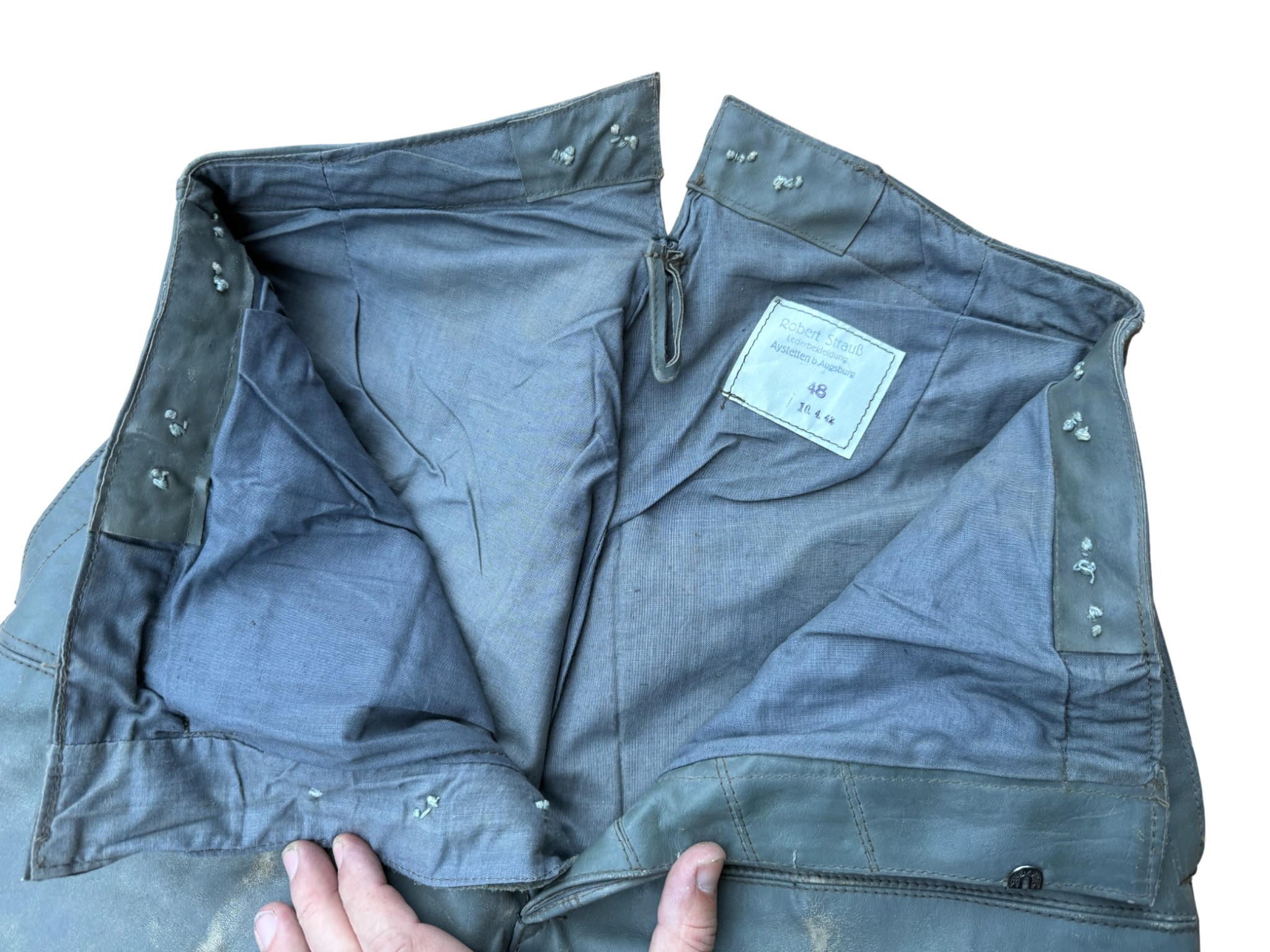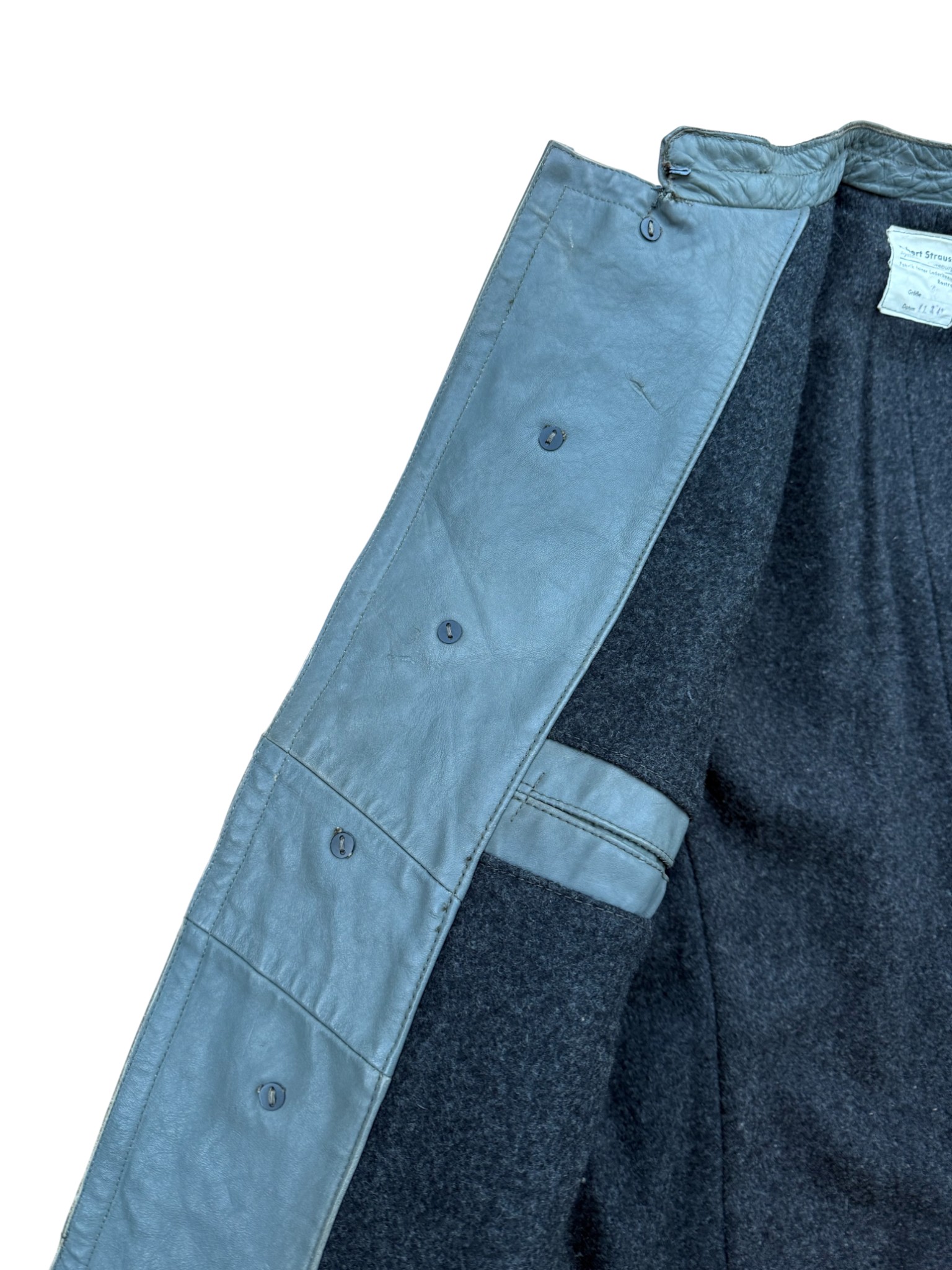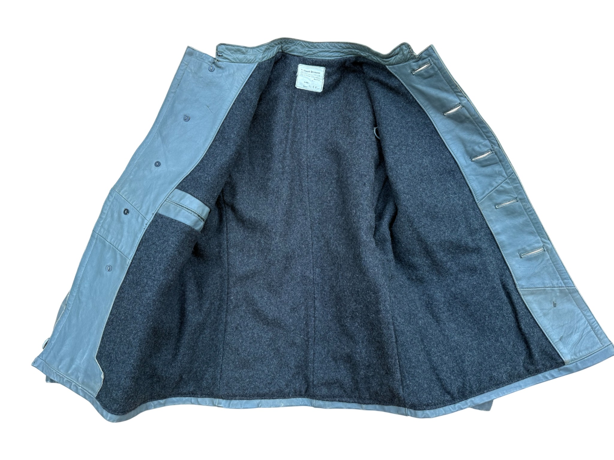 Kriegsmarine gray protective leather jacket and trousers “uboot” set in perfect condition, all orginal sevn buttons on jacket – looks like unused. all with same marker label. Hard to upgrade set !