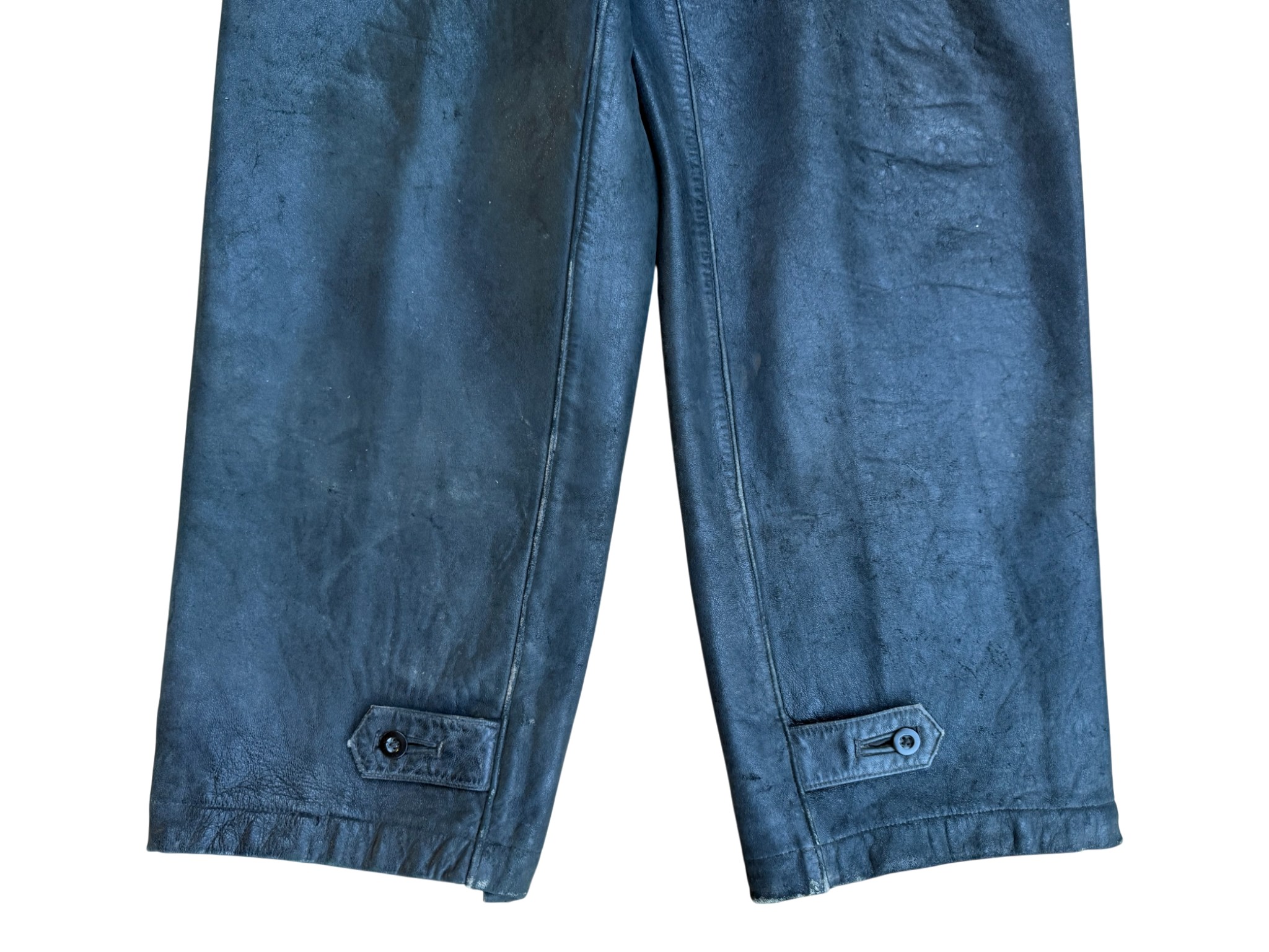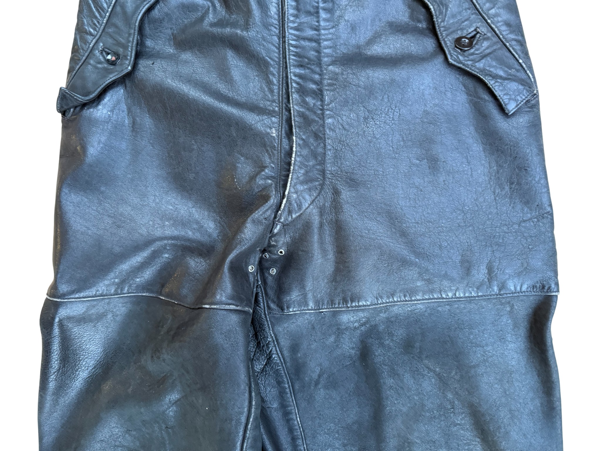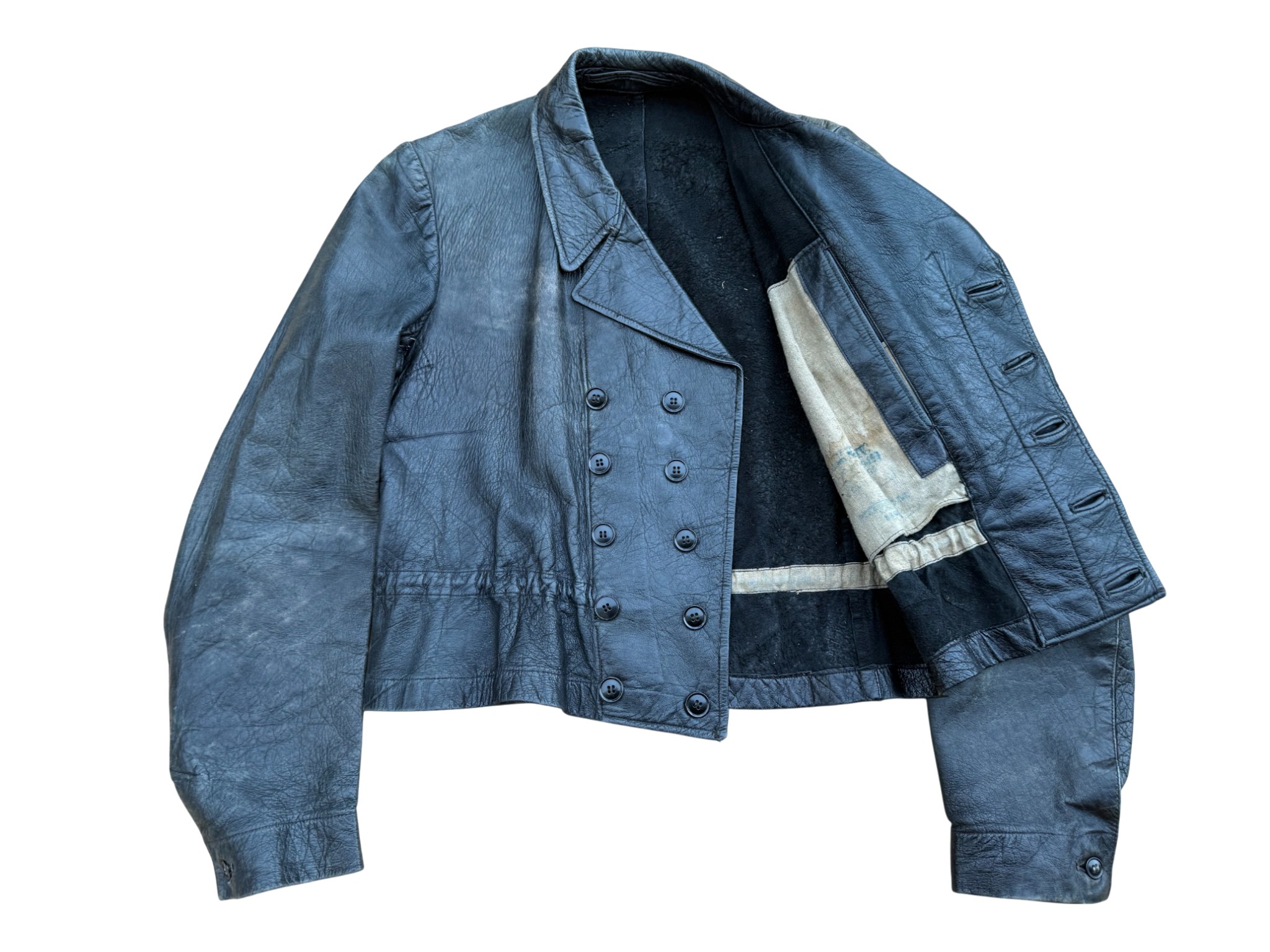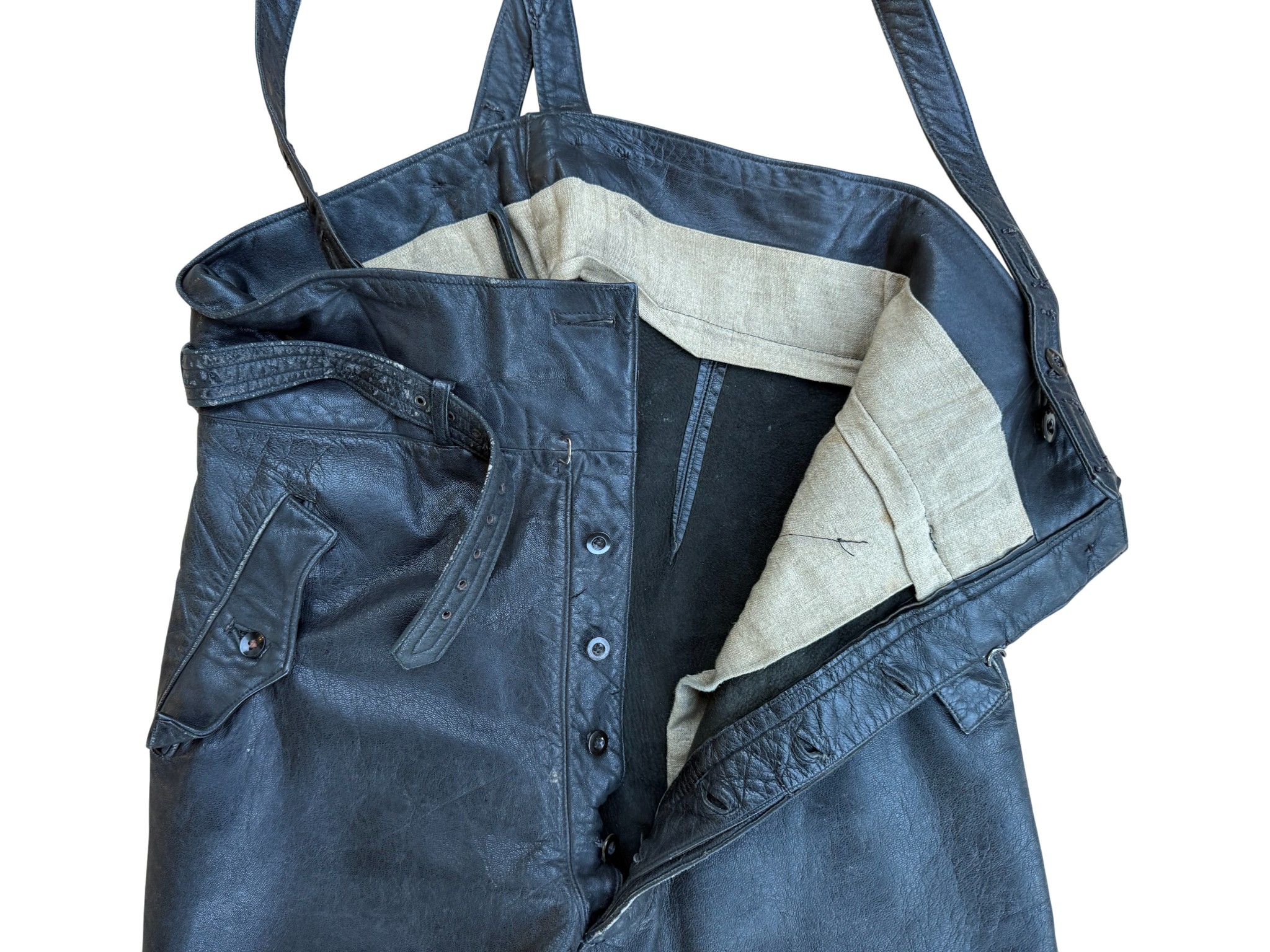 Kriegsmarine Kleinkampfverbände Black protective leather jacket and trousersset in perfect condition, all orginal sevn buttons on jacket – looks like unused. Set with good contion trousers, all with stamps. Hard to upgrade set !