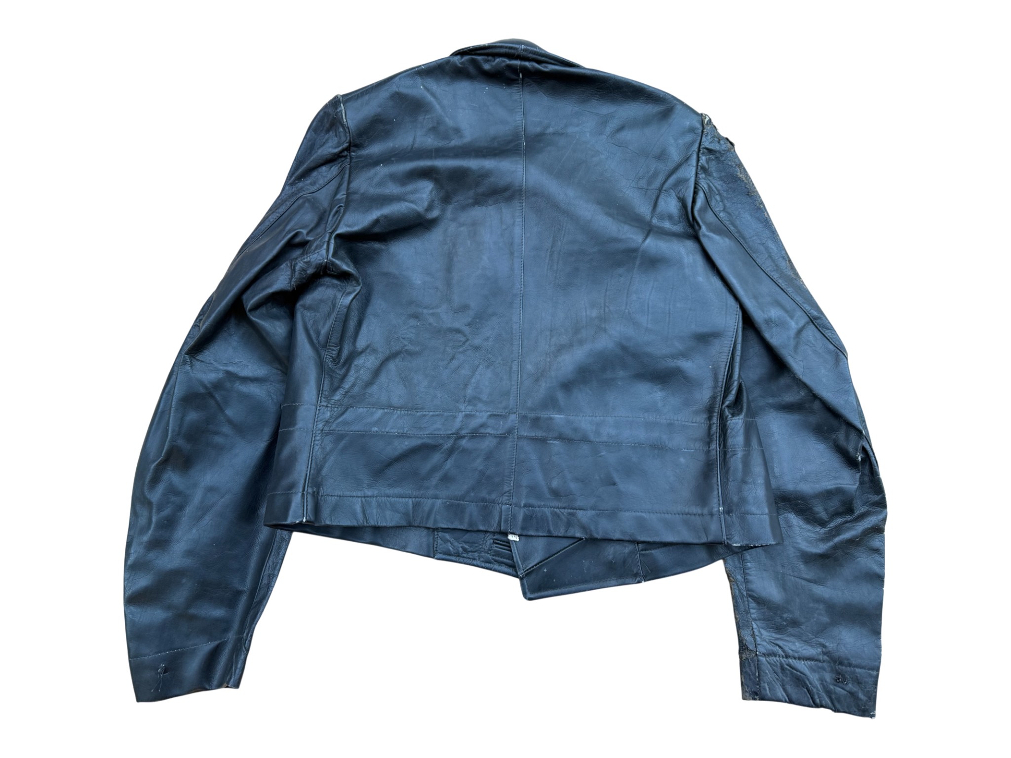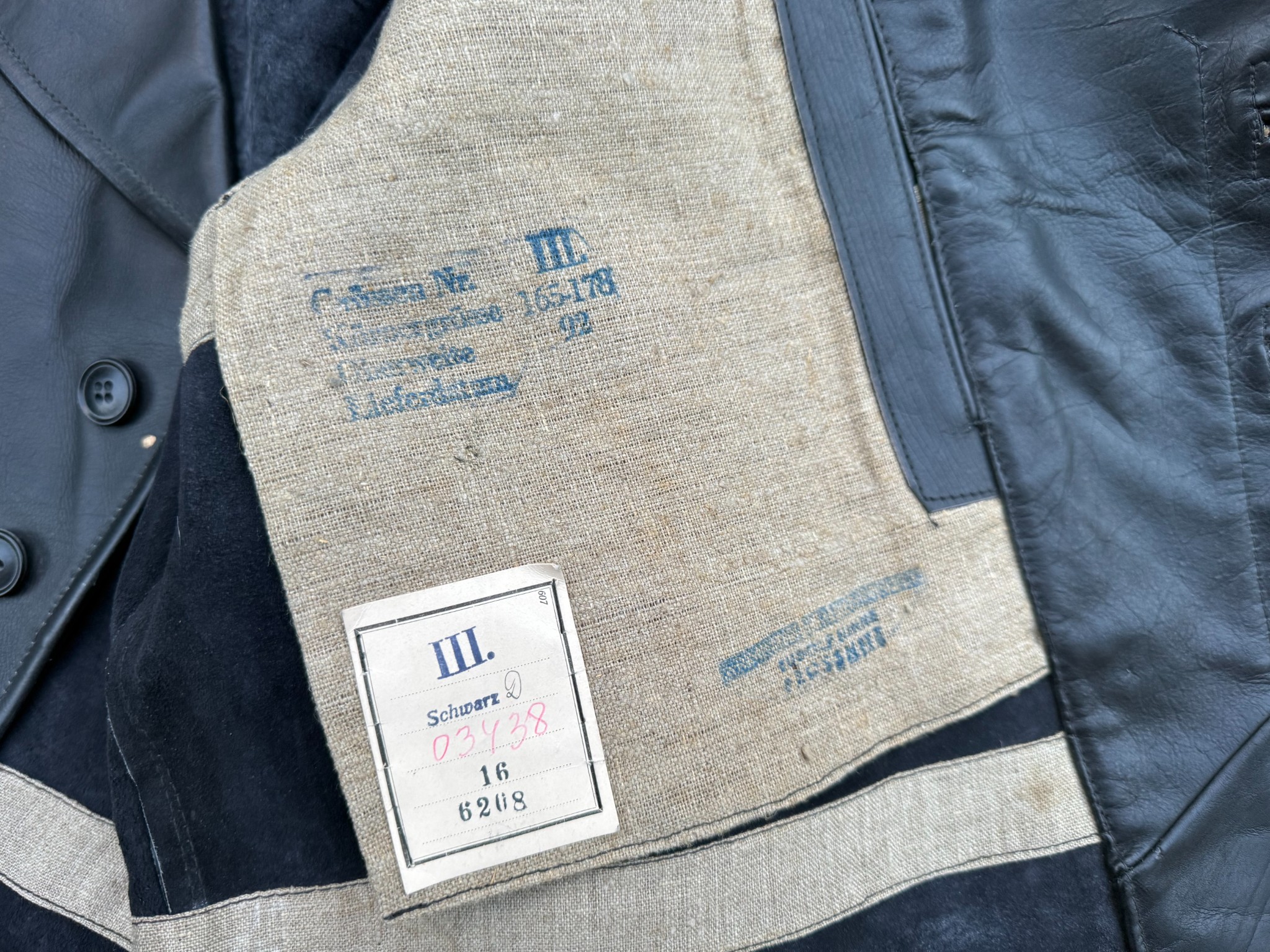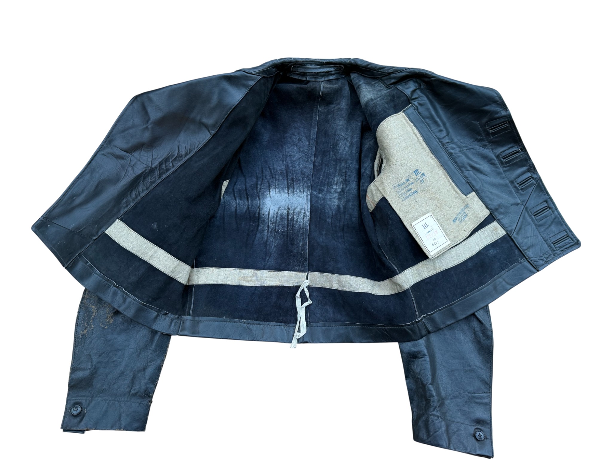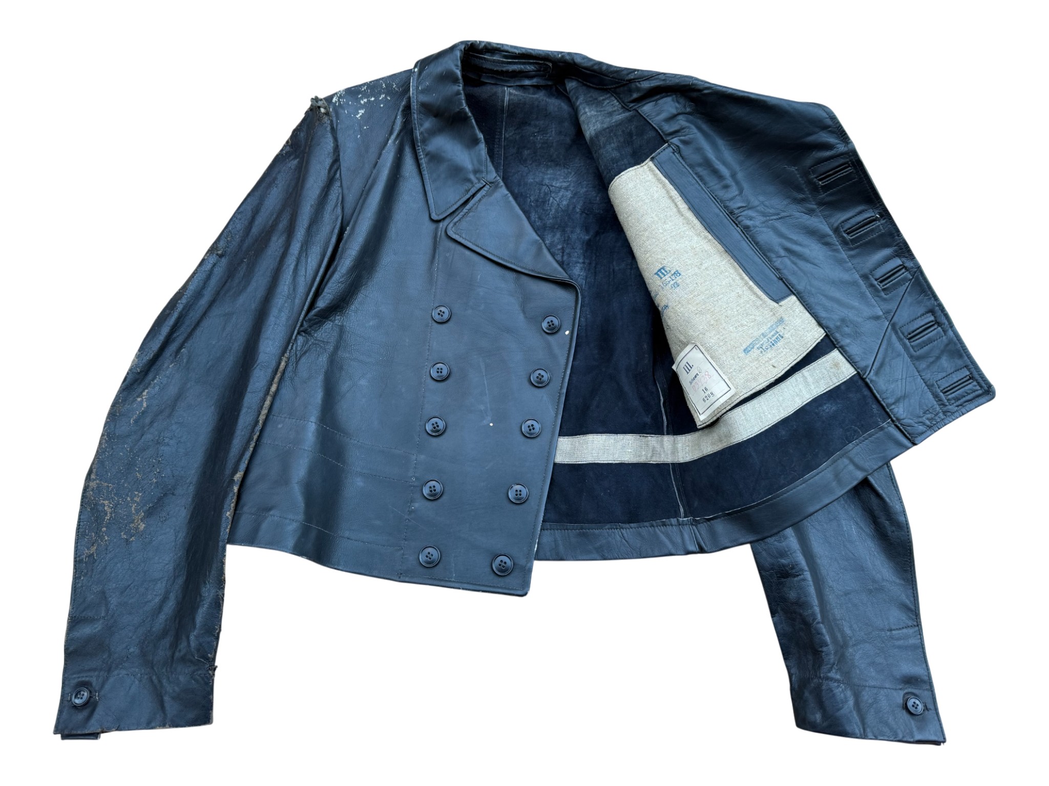 Kriegsmarine Kleinkampfverbände Black protective leather jacket, with paper tag. It has signs of storage, some abrasions, and a split seam on the sleeve. Generally good condition