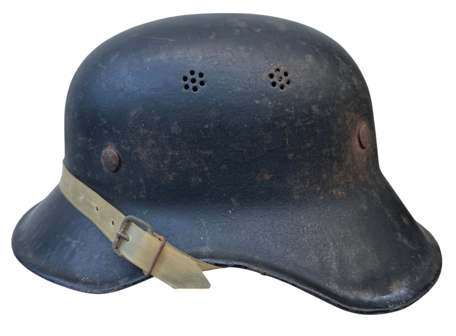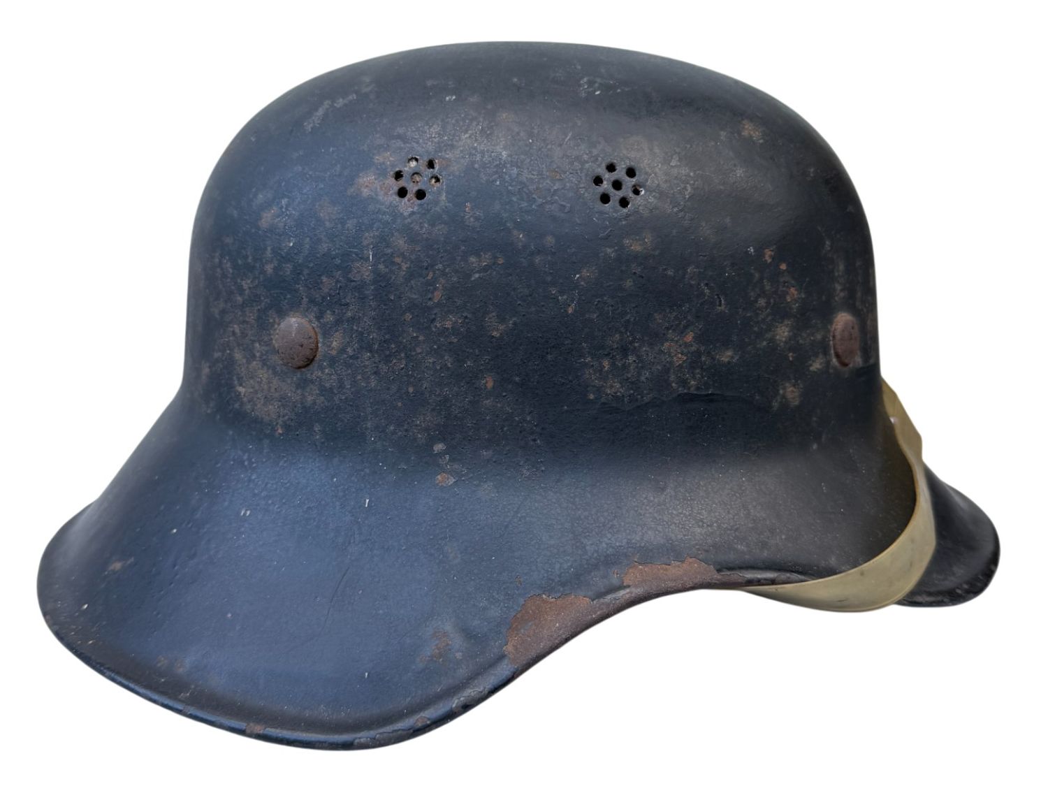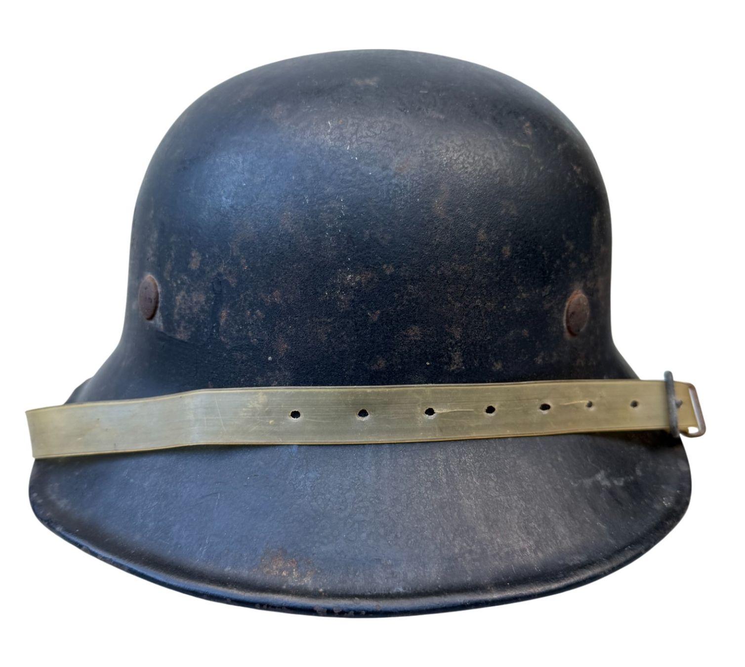 Last model of luftschutz helmet, typical w/o decal, clear plastic chinstrap. Good unused condition.