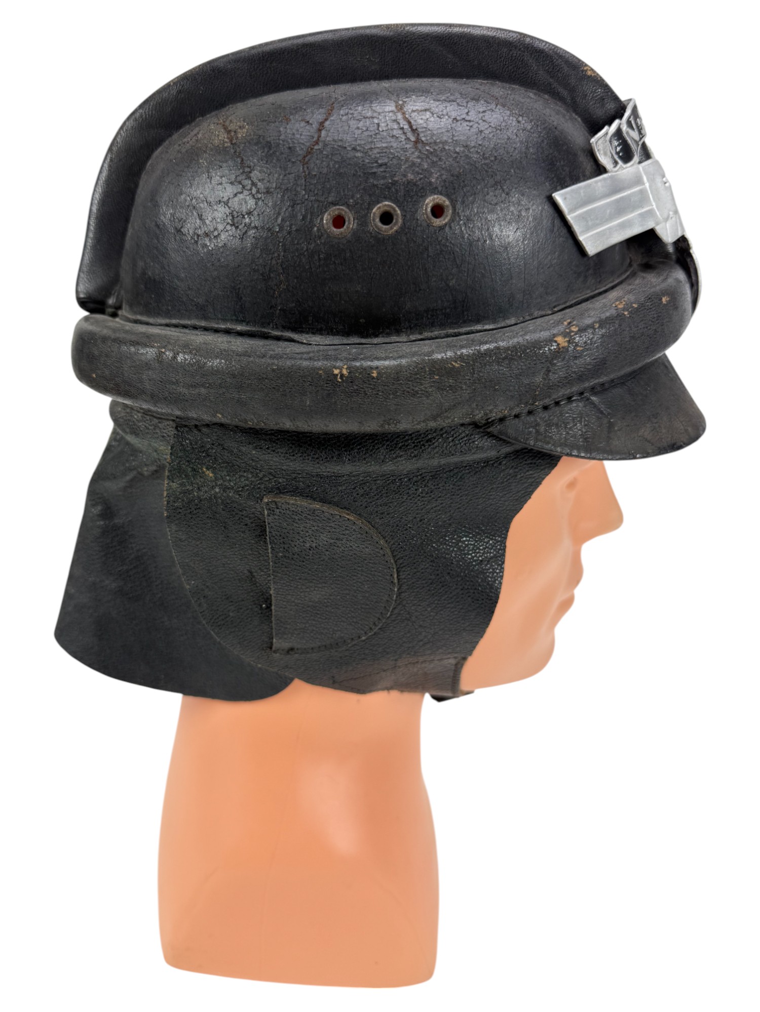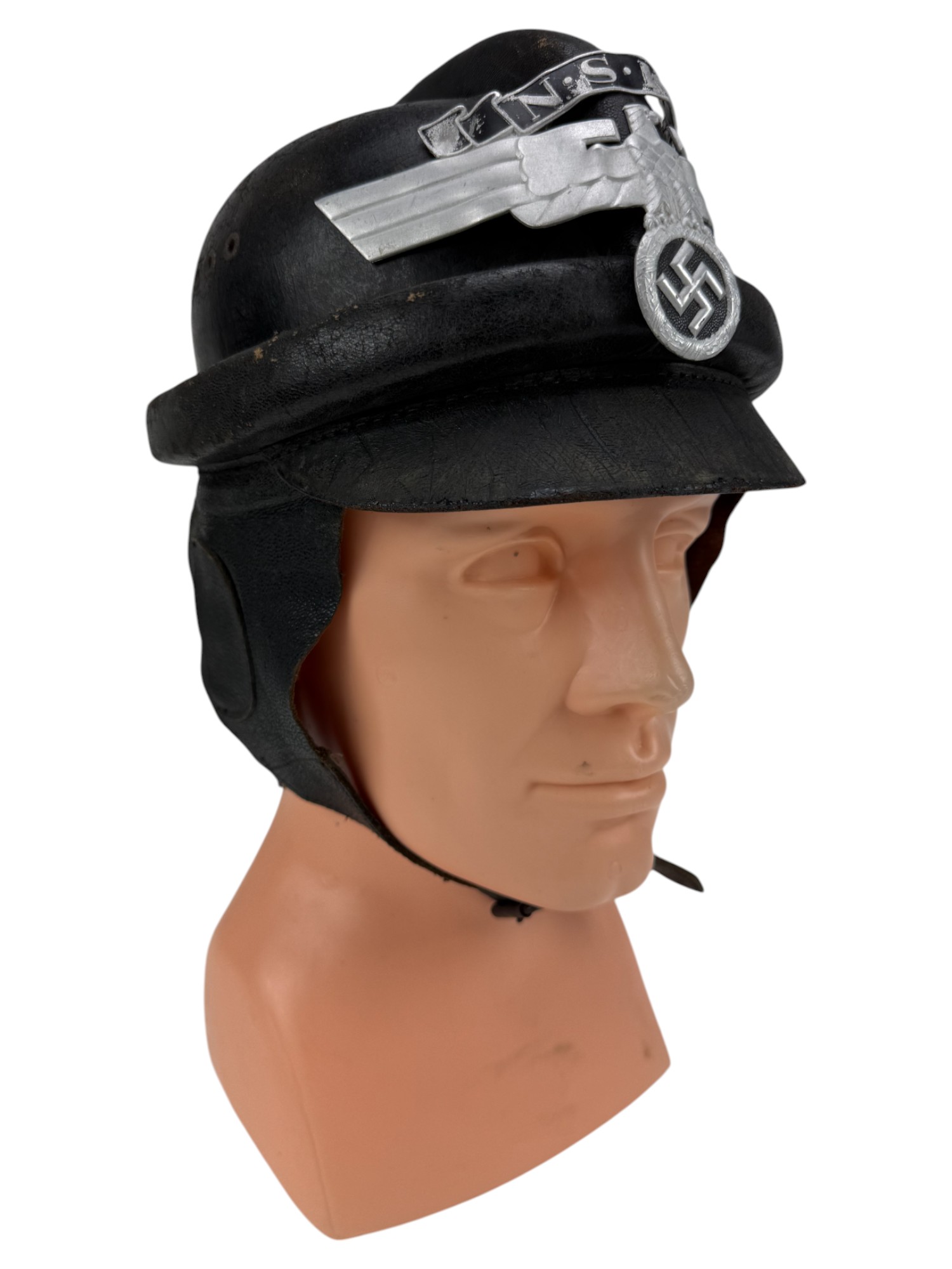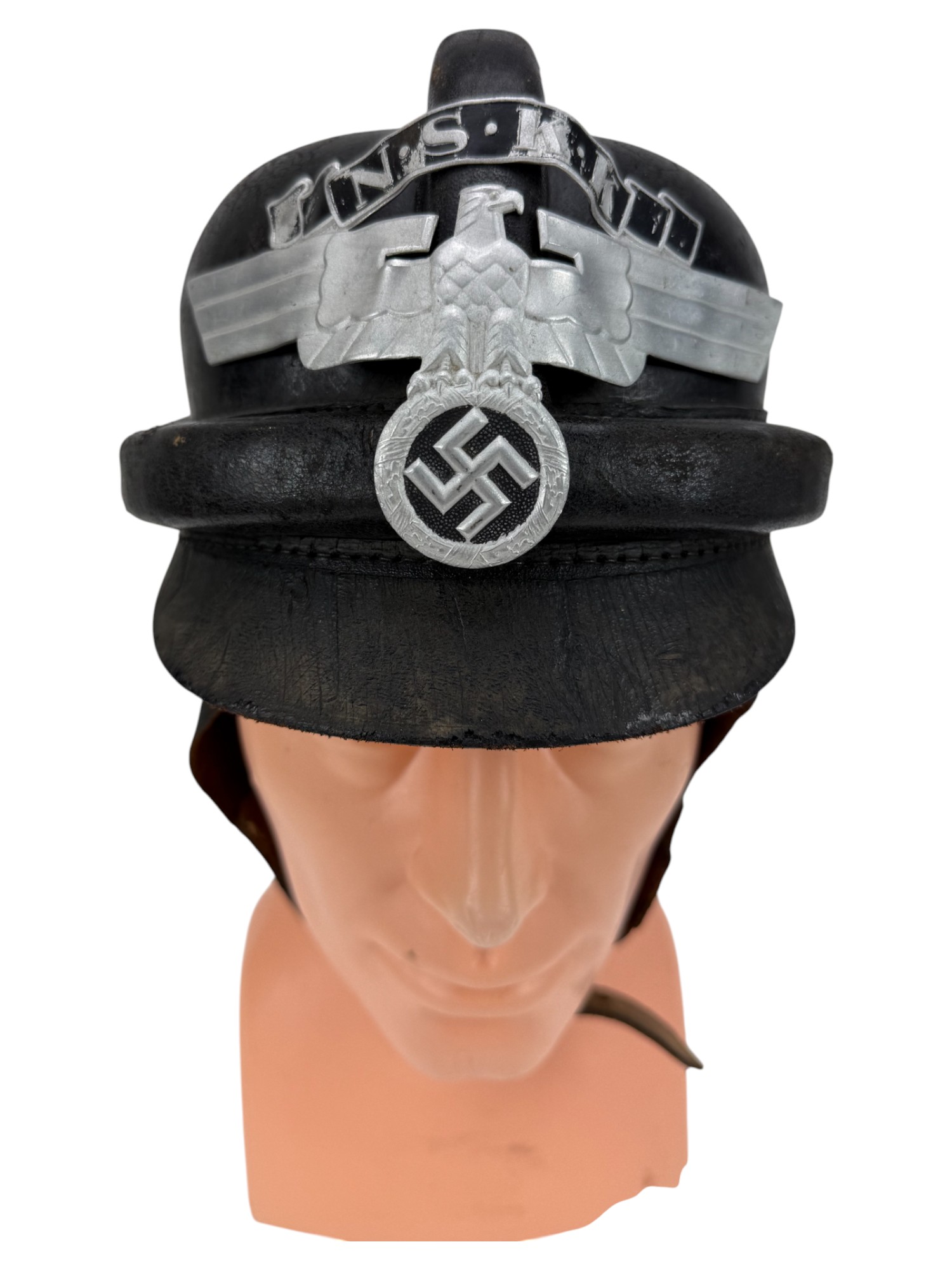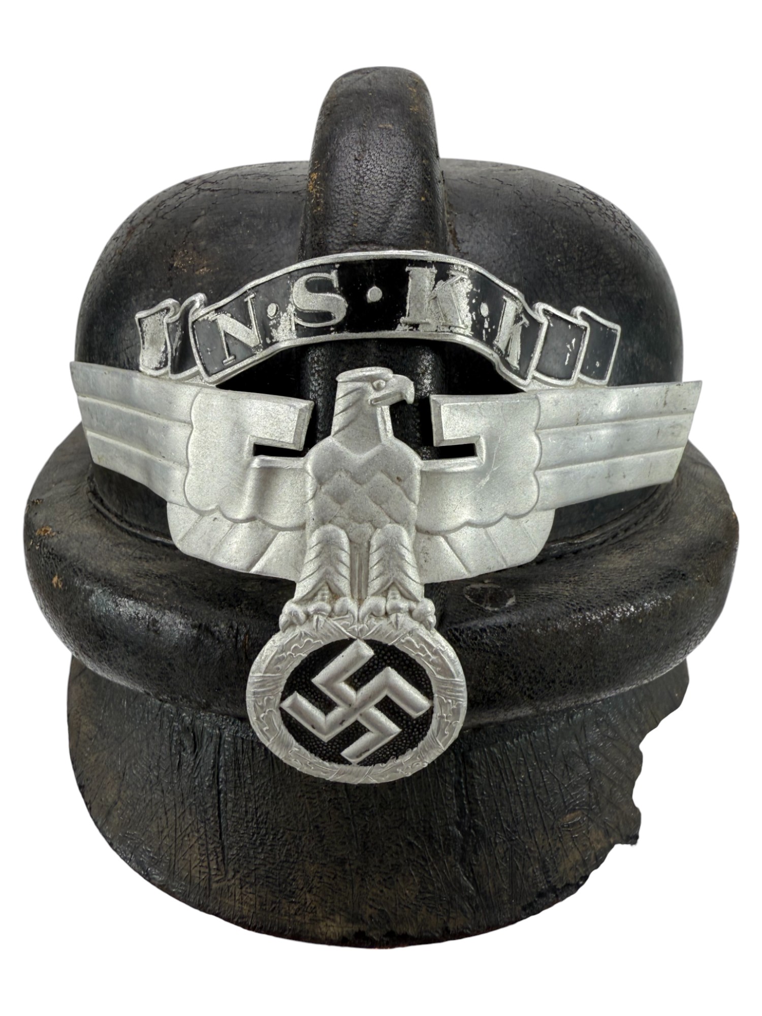 Nskk Crash Helmet, in good condition, with nice wisible stamps and size stamps. Straps w/o damages. Leather soft. Huge aluminium eagle with visble prong damage (left side) but it holds the helmet nicely.