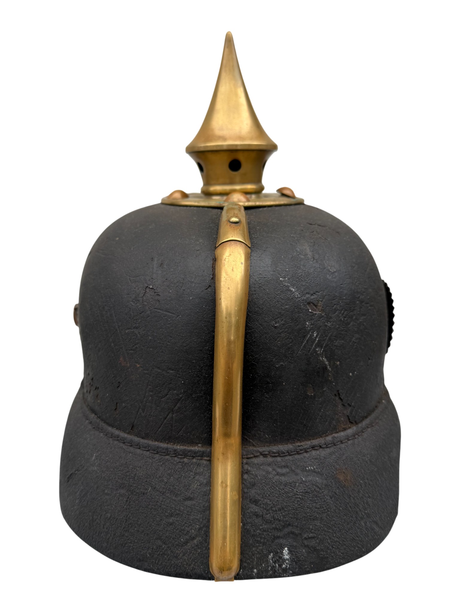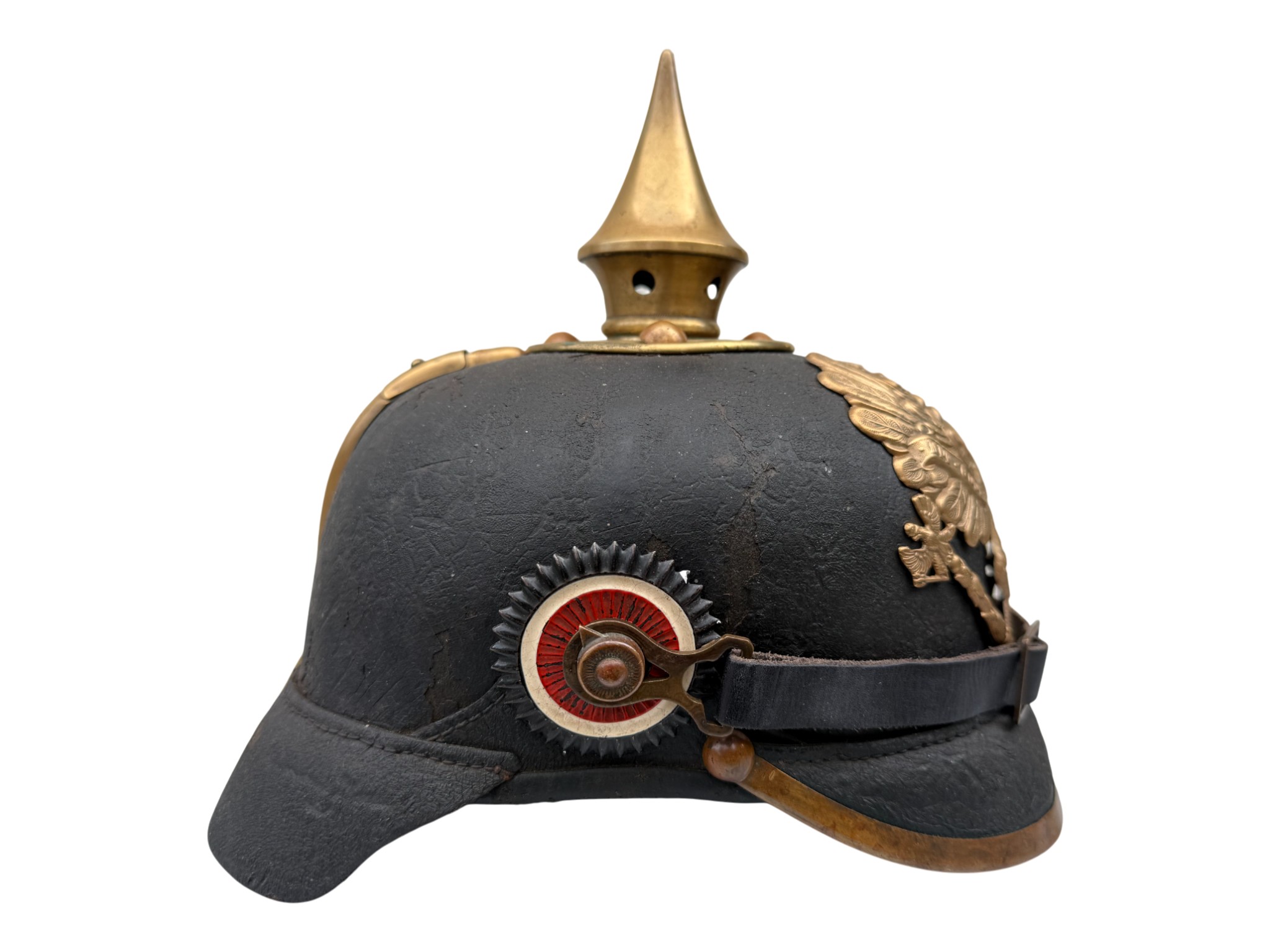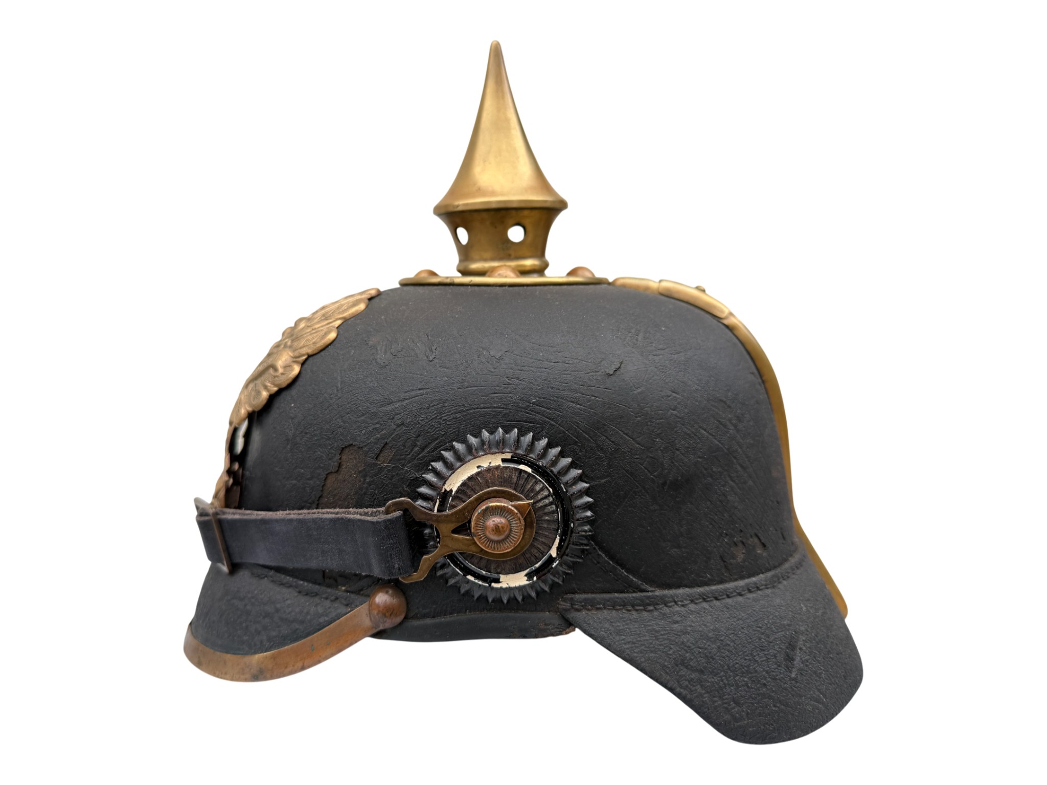 WWI Prussian M1896 Infantry EM Pickelhaube, good worn condition, chinstrap looks like repro.