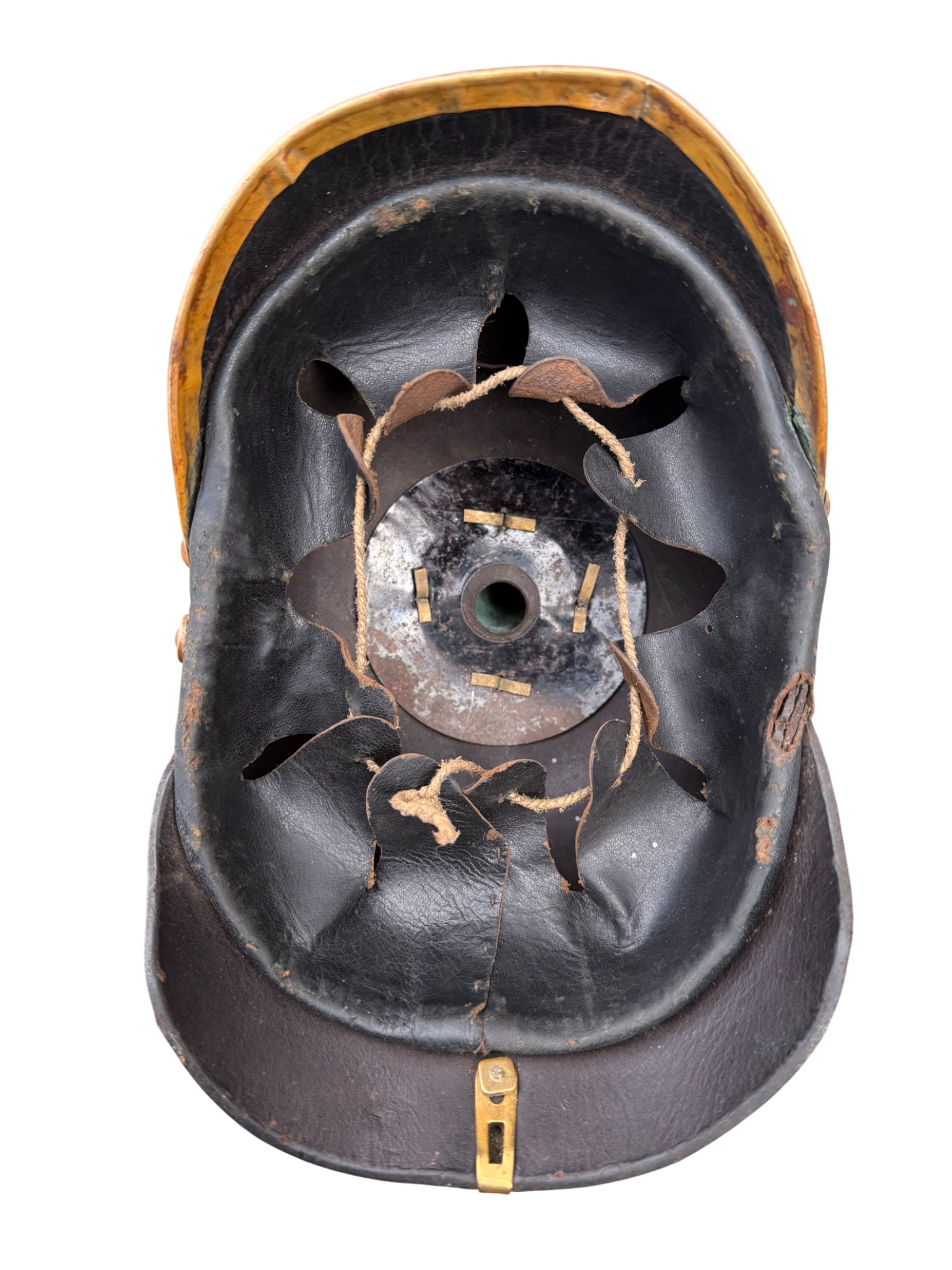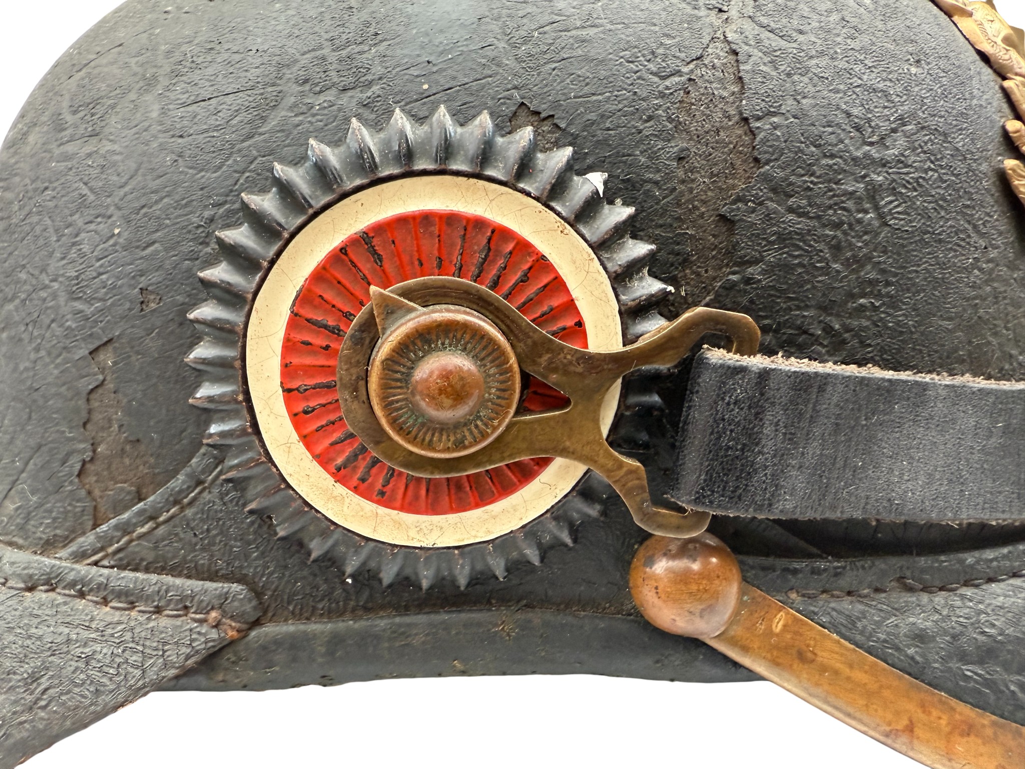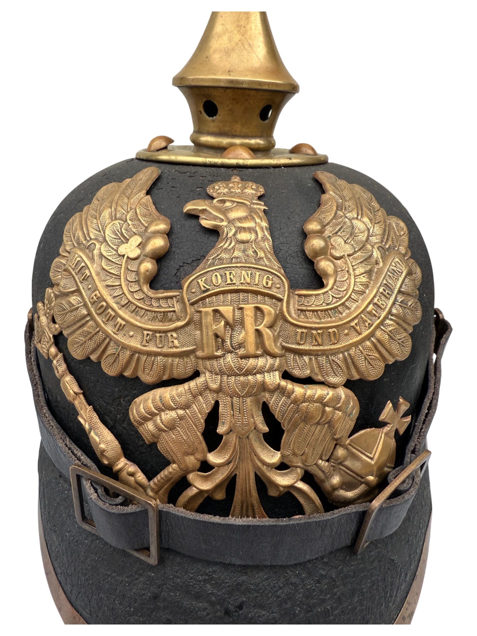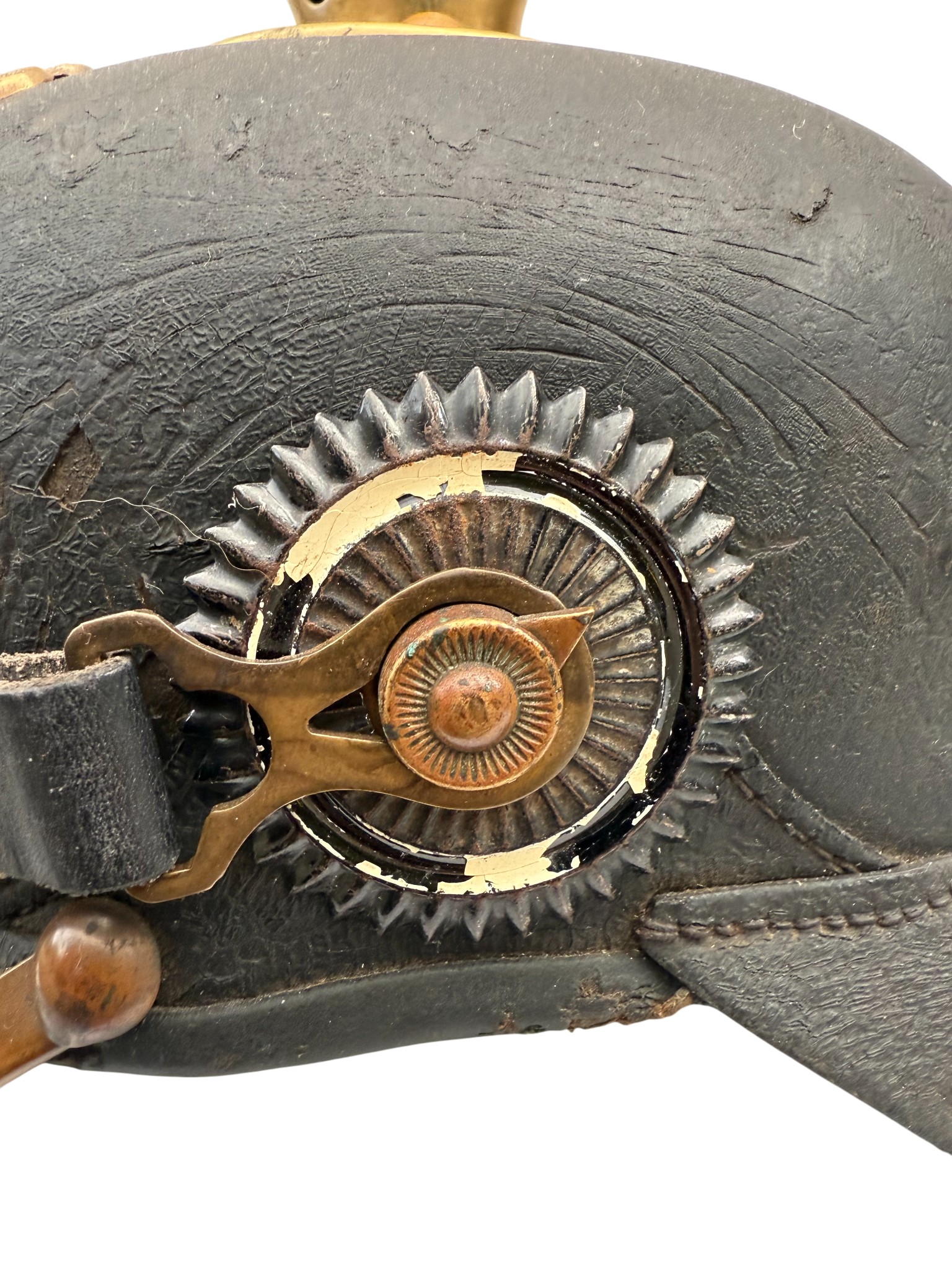 WWI Prussian M1896 Infantry EM Pickelhaube, good worn condition, chinstrap looks like repro.